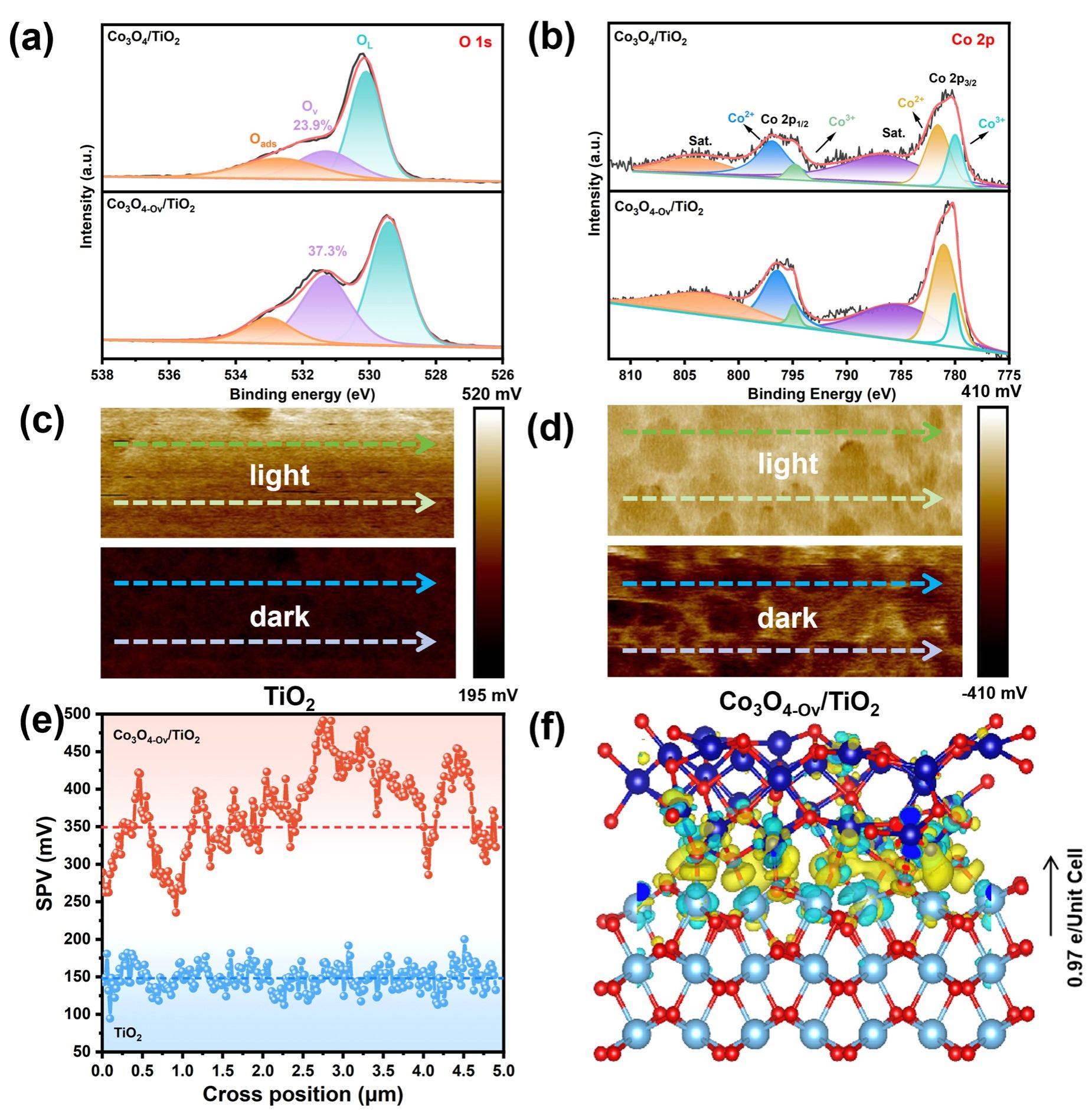 XPS 结果进一步表明了 Co3O4 中富含氧空位,作为电子供体掺杂剂可以促进载流子的转移和分离。差分电荷密度计算和开尔文探针力显微镜(KPFM)技术清晰地阐明了Co3O4TiO2之间的电荷转移机制。当 p型半导体Co3O4n型半导体TiO2 在黑暗中接触时,由于TiO2 较低的费米能级和功函数,电子(e-)会从 TiO2 转移到 Co3O4,直至两者的费米能级达到平衡。这一过程中,界面处的电荷重新分布,在TiO2 Co3O4 之间形成内建电场,阻止了 TiO2 e-的持续转移。同时,TiO2 的能带边缘向上弯曲,而Co3O4的能带边缘则向下弯曲。在光照条件下,光生电子通过 p-n 异质结转移到 TiO2,而空穴(h+)则转移到Co3O4,从而实现了高效的电荷分离。此外,TiO2中的电子会通过({111}/{101} /{110})晶面异质结进一步转移至基底,并迅速到达阴极。综上所述,Co3O4-Ov/TiO2材料表现出优异的光电化学性能,归因于氧空位和双异质结(“p-n/晶面结)的协同作用。