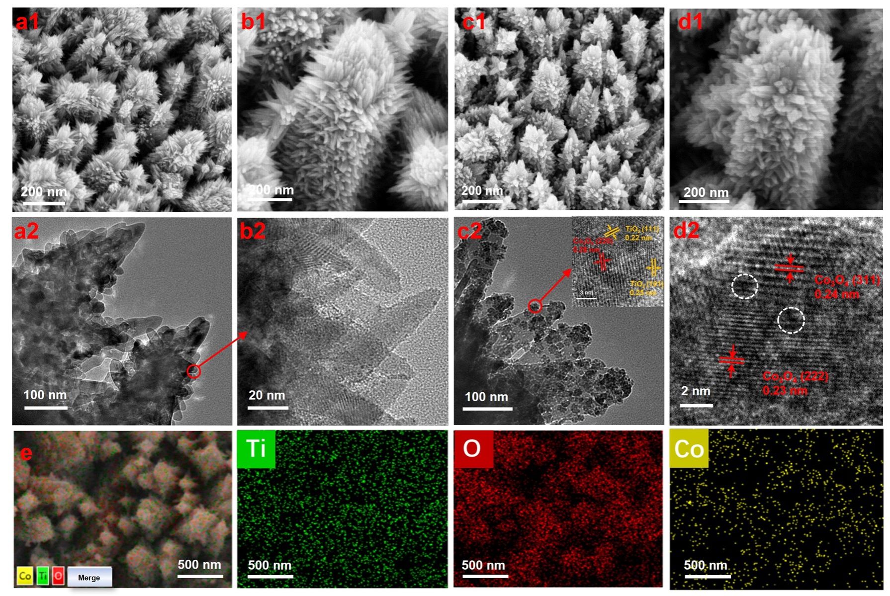 SEMTEM表征结果显示:Co3O4-Ov/TiO2光电极材料的基底结构是由Ti网上原位生长的一维有序TiO2纳米棒和二维纳米锥构成。同时,零维的Co3O4纳米颗粒均匀分布在3D TiO2结构上,其无序的晶格和模糊的边界均表明存在氧空位。