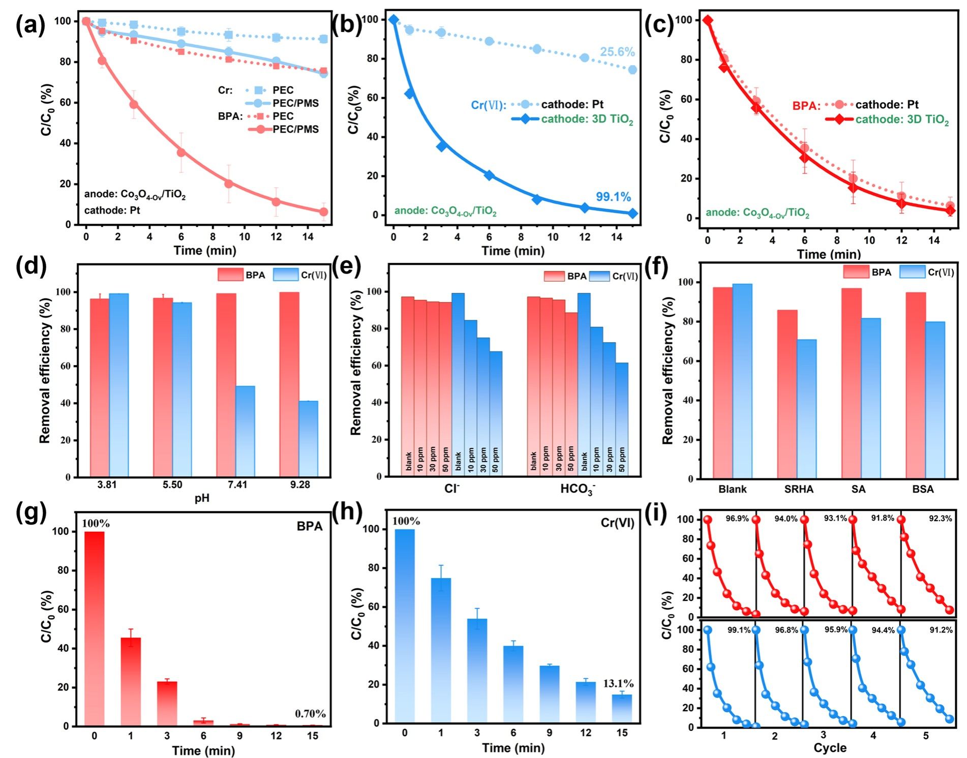 best365中国官方网站化学科学与工程学经理聘副教授张亚男长期致力于水环境污染物的高效去除相关研究,研究团队近期采用界面工程和缺陷工程的双重修饰策略,设计了一种兼具氧空位(Ov)和双异质结协同效应的Co3O4-Ov/TiO2光电极材料,并通过光电催化(PEC)耦合过氧单硫酸盐(PMS),构建Co3O4-Ov/TiO2-PEC/PMS协同体系,实现了对BPACr(VI)的高效同步去除,相关研究成果以“Interface and Defect Engineering in 3D Co3O4-Ov/TiO2 to Boost Simultaneous Removal of BPA and Cr(VI) upon Photoelectrocatalytic/Peroxymonosulfate (PEC/PMS) System”为题发表于国际知名期刊《先进功能材料》(Advanced Functional Materials)