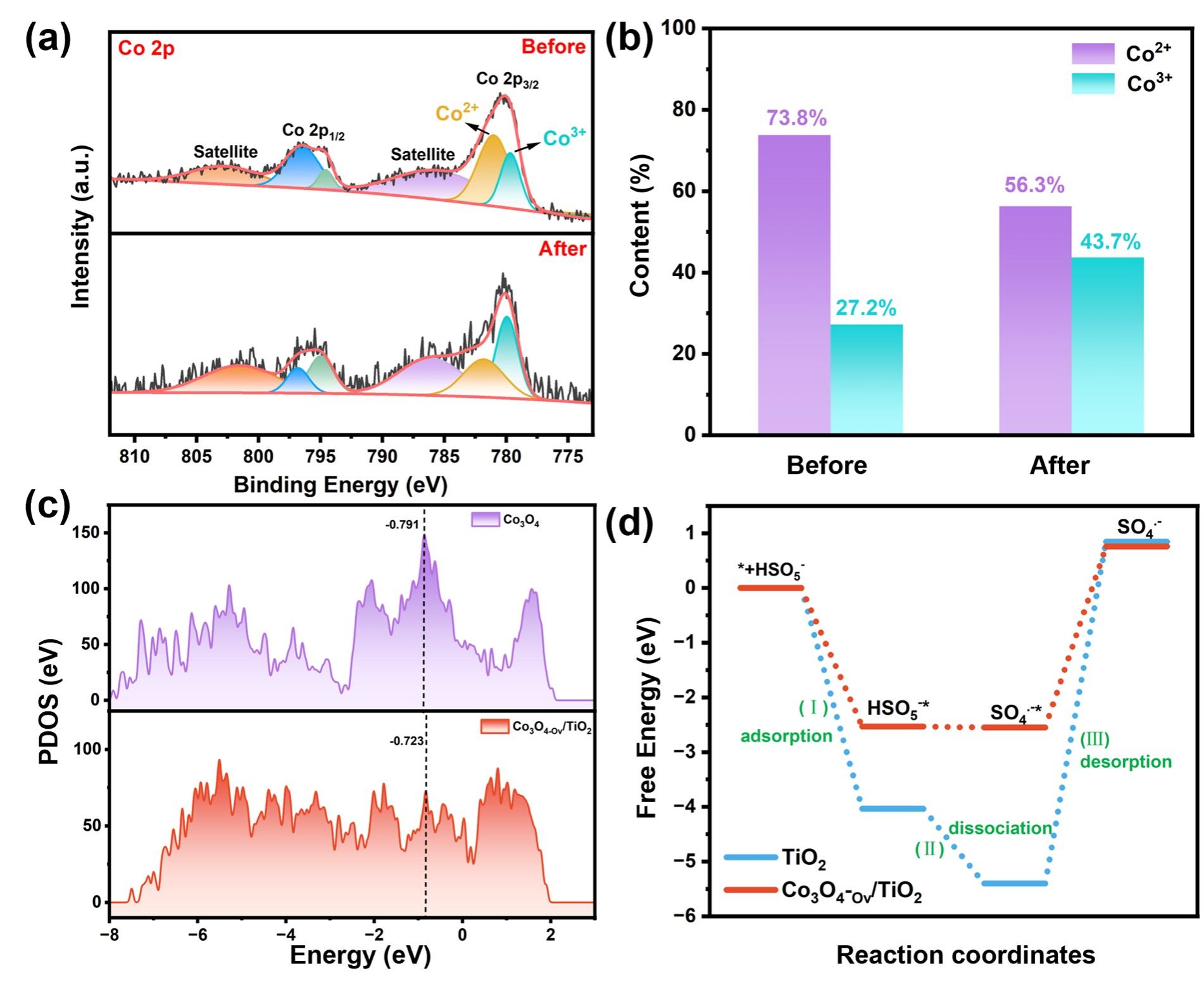 XPS表征表明Co3O4-Ov/TiO2Co3+/Co2+氧化还原循环能够加速PMS的活化。DFT计算进一步详细揭示了光电极与PMS分子之间的相互作用机制。偏态密度(PDOS)分析表明,PMSCo3O4-Ov/TiO2之间的键合更为稳定,这意味着Co3O4-Ov/TiO2PMS具有更强的化学吸附能力。此外,通过计算吉布斯自由能(ΔG),对PMS的整体活化过程进行了热力学分析,结果表明引入Co3O4显著提升了PMS的活化效率。