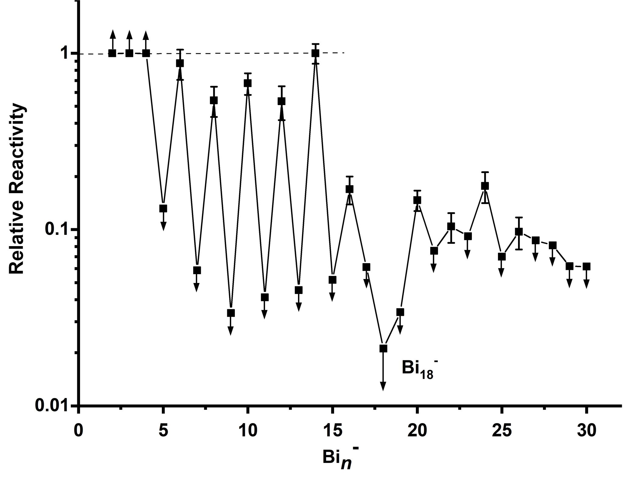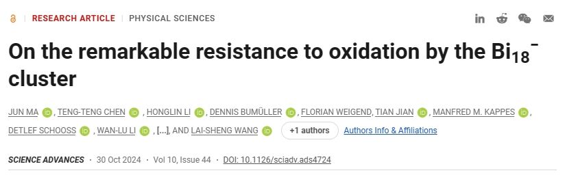 铋(Bi: 6s26p3)是一种独特的主族金属,其导电性几乎是所有金属中最低,也最具反磁性。因为每个铋原子含有奇数个价电子,所以按照一般金属团簇模型,铋团簇系列的稳定性应该呈现出奇偶振荡特征,其中含有未成对电子的团簇尺寸应该具有高化学活性。best365中国官方网站邢小鹏教授课题组联合种美德三国科学家对铋团簇进行了深入探究,在对铋团簇负离子(Bin-, n=2-30)与O2的反应研究中观察到了预期的奇偶振荡趋势,但同时发现了一个异常奇特的铋团簇——Bi18-。近日,相关研究成果以《On the Remarkable Resistance to Oxidation by the Bi18⁻ Cluster》为题在线发表于Science Advances。