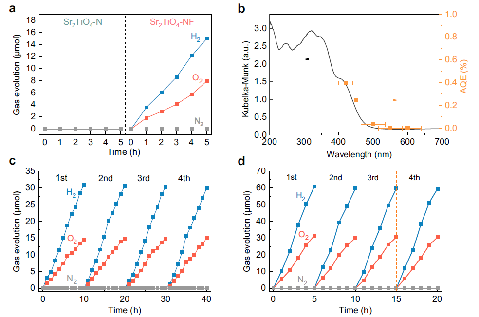 相较于传统的氮化策略,氟促进氮化策略成功实现了可见光驱动的全分解水反应,H2和O2以化学计量比稳定生成。材料在420纳米处的表观量子产率达到0.39%,太阳能至氢能的转化效率达到0.028%,优于目前报道的可见光响应全分解水材料。