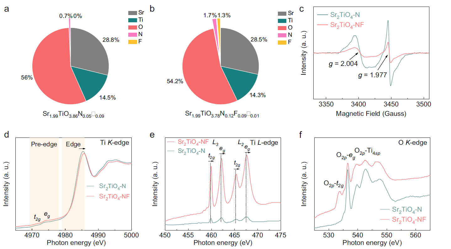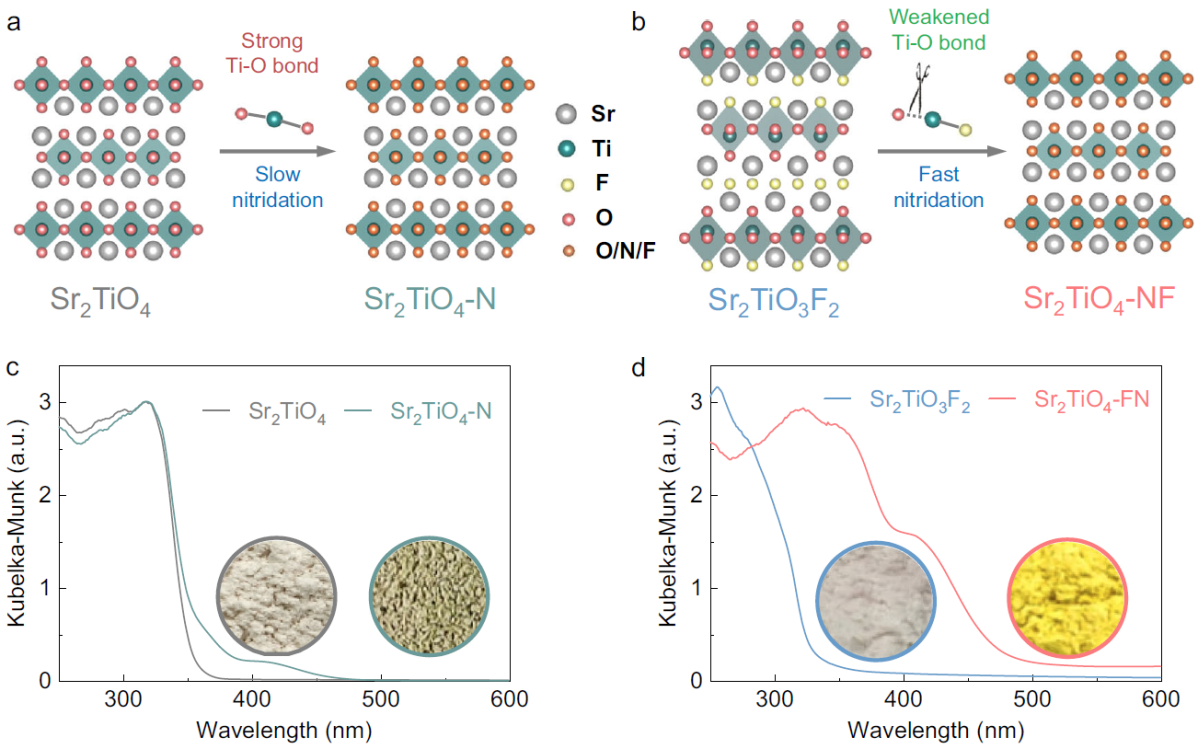 研究团队通过构建氟取代前驱物Sr2TiO3F2,利用氟的诱导效应高效氮化Sr2TiO4,获得具有可见光响应的窄带隙半导体光催化剂。一方面,氟具有最大的电负性,可以显著弱化Ti-O键,实现高效O/N取代;另一方面,氟可以作为氮的共掺杂剂,有效避免O/N取代导致的电荷失衡,抑制缺陷的生成。紫外可见吸收光谱表明,氟促进氮化Sr2TiO4策略可以实现材料吸收边有效红移至可见光区,明显优于传统的氮化策略(只有吸收拖尾,无吸收边红移)。
