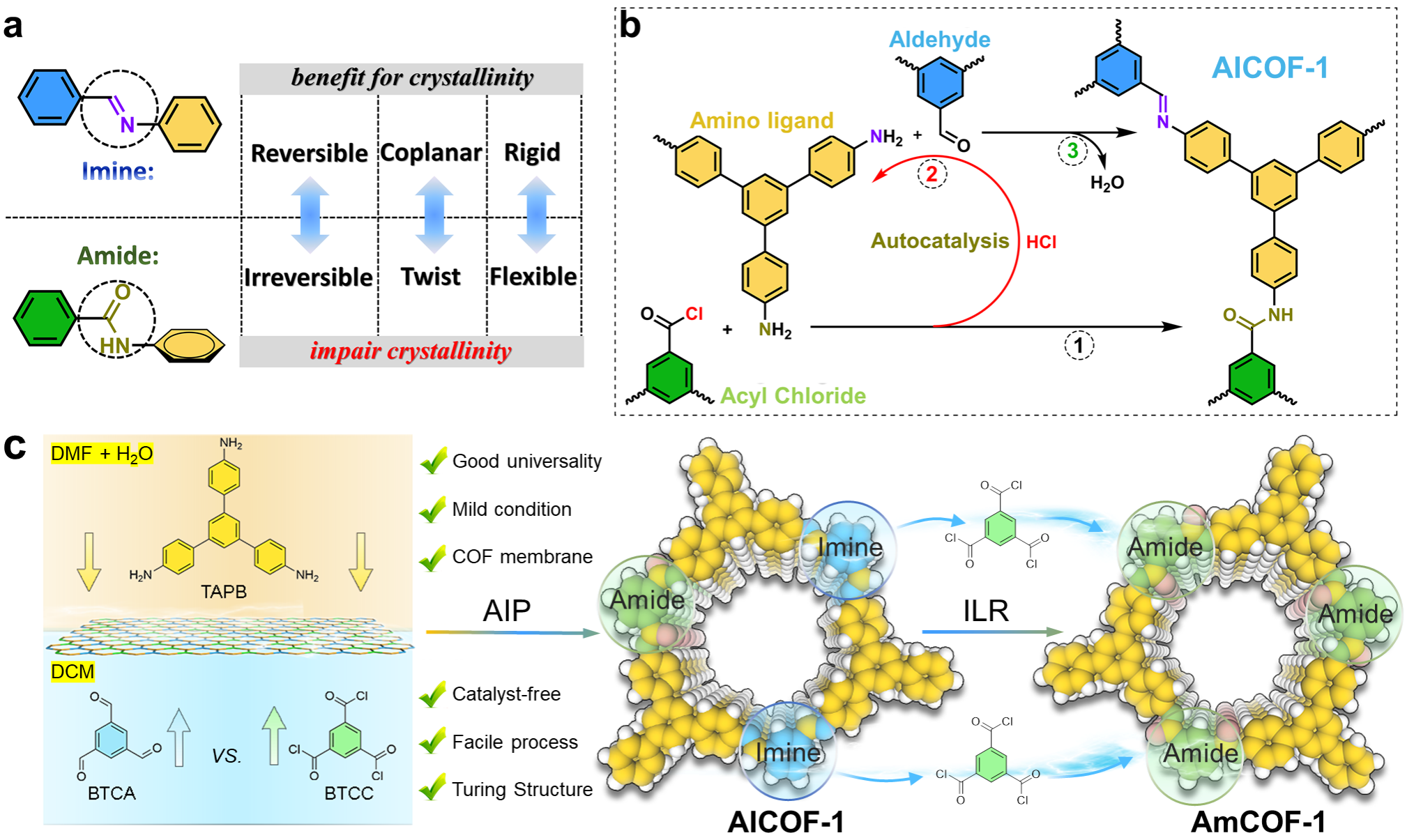 共价有机框架(COFs)是一种新兴的晶态多孔聚合物材料,具有多种多样的拓扑和有序堆叠的有机网络结构。其结晶度源于框架的长程有序,是材料独特性质以及在分离和催化等方面实现应用的关键。然而晶态COFs材料的合成从机制上严格依赖于可逆的动态化学过程,这主要是由于可逆的动态化学在自组装形成晶体的过程中具有“错误检查和纠正(ECC)”的能力,进一步降低了组装的速度从而能获得高度的结晶性。由动态可逆键构建的COFs不可避免的具有稳定性不足的缺点,极大的限制了其在各种条件下的实际应用。因此,迫切需要开发一种通用的合成方法,合成完全由不可逆键键连的高结晶性COFs,这也是该领域面临的巨大挑战。best365中国官方网站李良春教授课题组提出了自催化界面聚合的方法,实现了高结晶性不可逆酰胺键COFs自支撑图灵膜的制备,相关研究成果近日以“Autocatalytic Interfacial Synthesis of Self-Standing Amide-Linked Covalent Organic Framework Membranes”为题发表于化学领域知名期刊《德国应用化学》(Angewandte Chemie International Edition)。