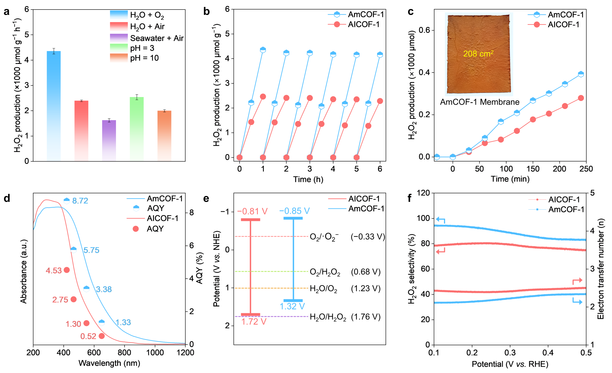 得益于内置酰胺单元良好的稳定性、可促进电子―空穴分离以及通道内激子的快速解离,在氙灯和无牺牲剂的条件下结构简单的AmCOF-1膜实现了4353 µmol g−1 h−1的H2O2光合成速率,并且自然光照下能在150小时表现出长时的卓越稳定性。鉴于现在绝大多数报道的COFs是由亚胺键构筑,通过该合成方法把亚胺替换成更稳定的功能性酰胺单元,有望推动该领域向下一代高结晶性和稳定性的不可逆键COFs发展,独特的图灵结构使得酰胺COFs膜也有望在纳滤和催化等研究领域发挥重要的作用。