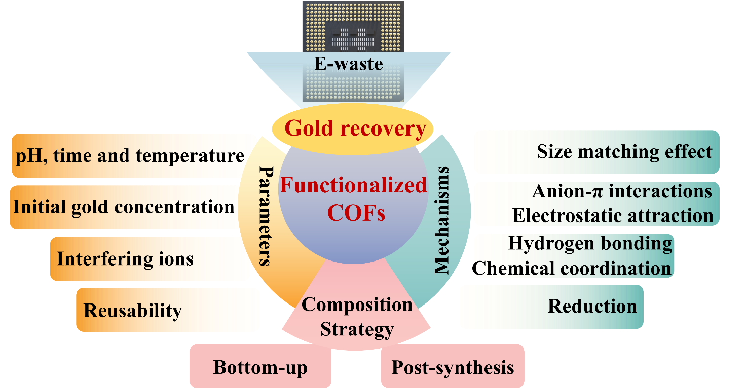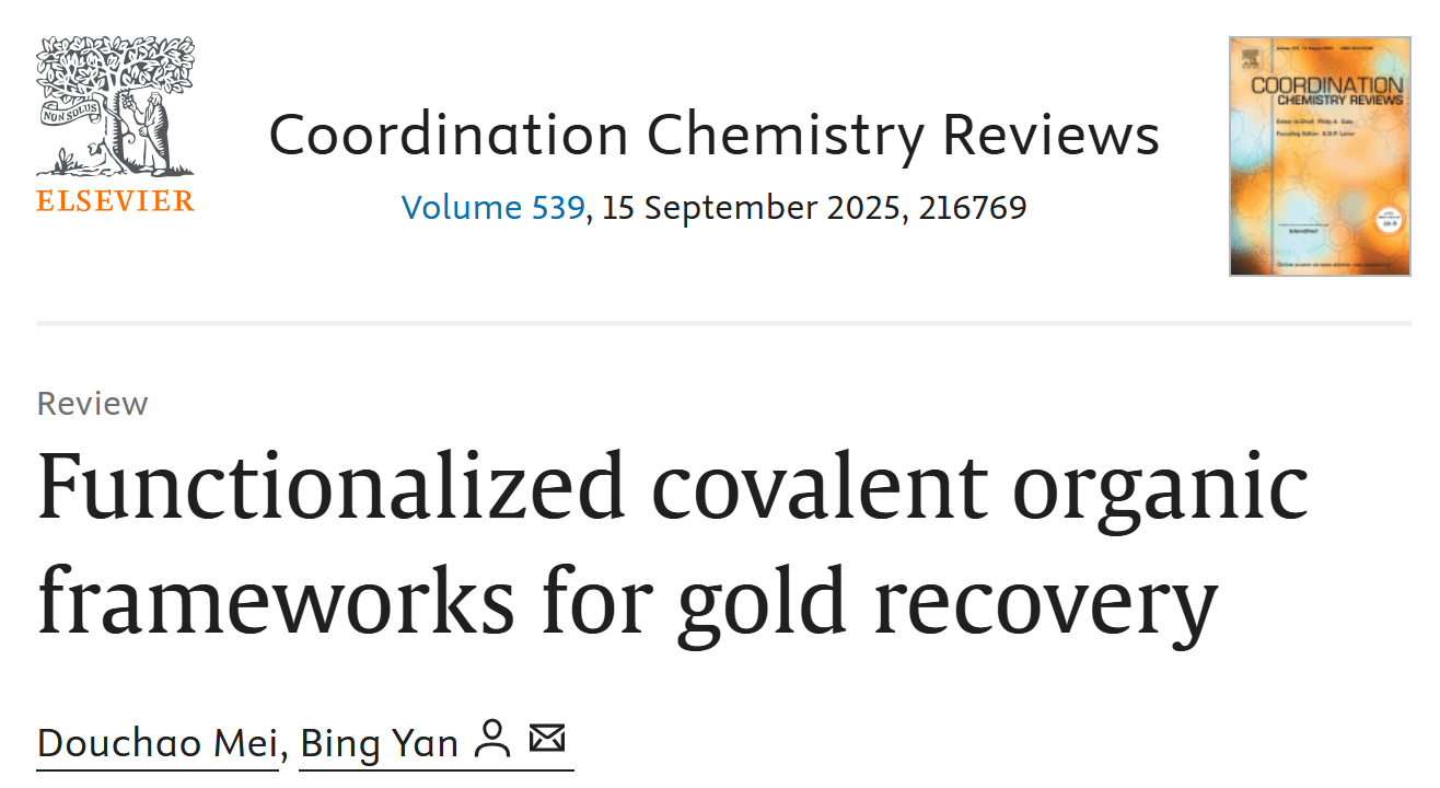 金,凭借其良好的物理和化学性质,在珠宝、电子和航空航天等领域发挥着重要的作用。而天然矿石中的金含量较低(约1-30 ppm),且不断增长的金消耗导致其天然丰度持续的下降。相比较之下,电子废弃物中的金含量较高(约1-2000 ppm),且由于金离子的毒性,电子废水的不恰当排放已经造成了严重的环境污染问题。因此,从资源的可持续利用和环境保护的角度出发,开发高效的金吸附剂,用于从二次资源中回收金就显得尤为重要。共价有机框架(COFs)材料,因其优异的热和化学稳定性、可控的孔结构、高的比表面积和丰富的活性吸附位点等优势,在金吸附领域引起了广泛的关注。相较于金属有机框架(MOFs)、多孔有机聚合物(POPs),COFs展现出更快的吸附动力学,更高的金吸附容量和更好的抗生物污染能力。近年来,闫冰教授团队在COFs材料金提取领域积累了较为丰富的经验,相关成果发表在Angew. Chem.、ACS Materials Lett.和Chem. Mater.等国际重要期刊。基于前期系统性工作和相关领域的研究进展,撰写的题为 “Functionalized covalent organic frameworks for gold recovery” 的文章近期在国际知名综述性期刊Coordination Chemistry Reviews上发表。