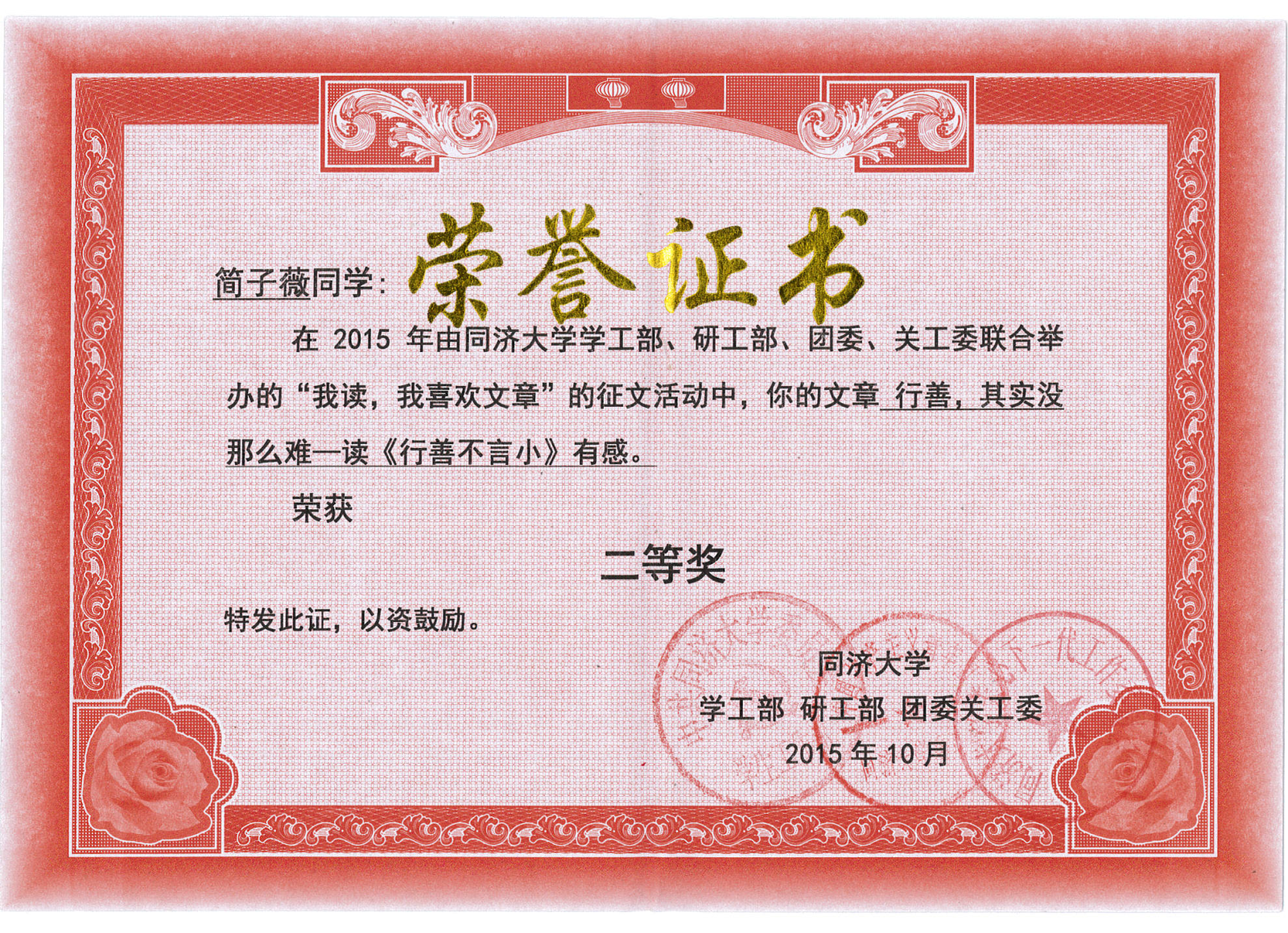11月11日中午,best365中国官方网站关心下一代工作委员会组织召开员工座谈会,并开展“我读,我喜欢文章”网上阅读活动读后感征文比赛颁奖仪式。我系简子薇、涂腾两位同学分获二等奖,王悦同学获三等奖,当天三位同学出席座谈会并发言,积极对关工委工作建言献策,并领取了证书。