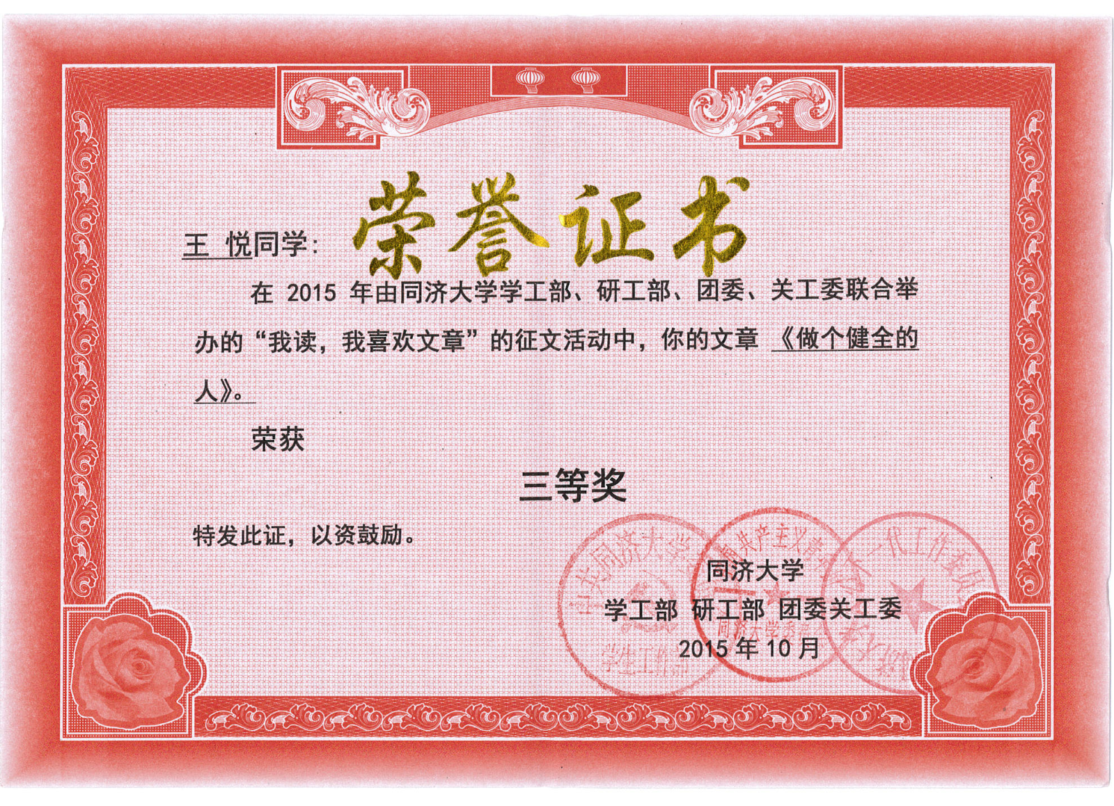 获奖征文链接3:做个健全的人——读《留美女博士被遣返:除了学习我什么都不会》有感(化学系 王悦)