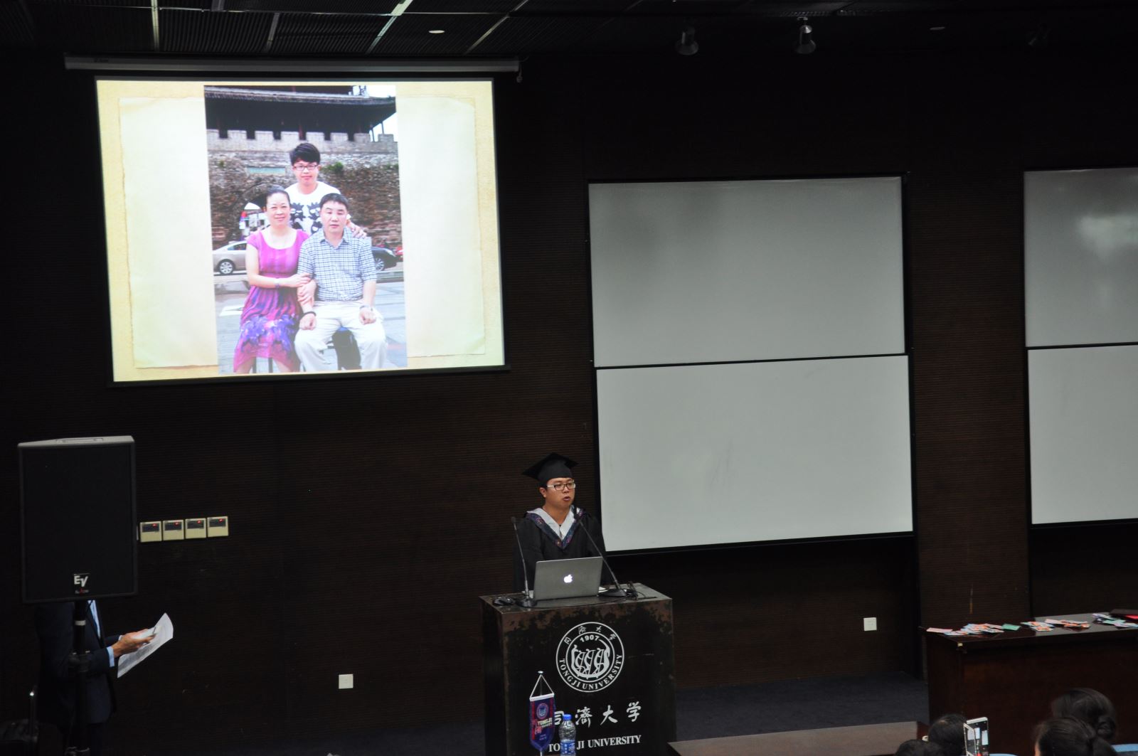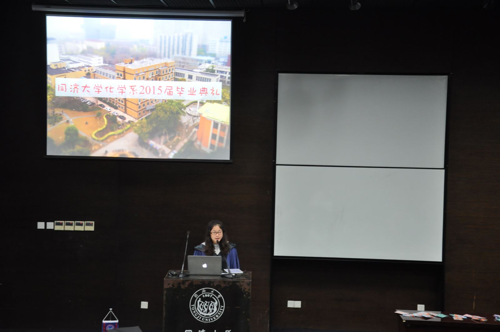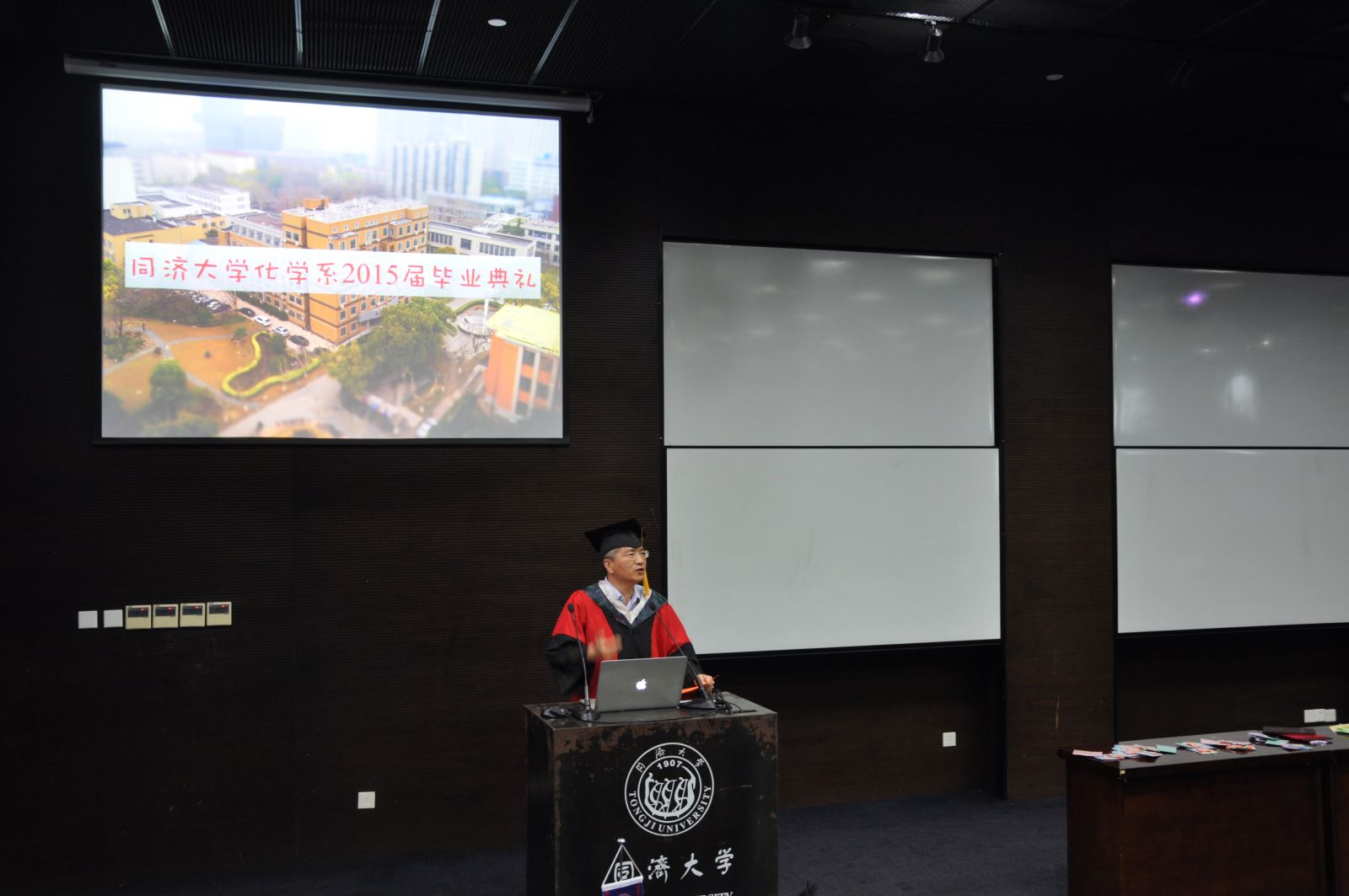 授证仪式将现场气氛引向了一个高潮,段甜伟、周佳俊同学分别代表毕业研究生和本科毕业生发表感言。段甜伟同学再次让在座的研究生回顾校园生活、科研之路,回忆大家一起“激扬青春,放飞梦想”的岁月;“毕业并不代表结束,而是宣布另一个开始”,她表示毕业了将自豪地作为“同济人”,在“同舟共济,自强不息”的精神引导下继续“严谨求实,团结创新”。周佳俊同学则用一张张图片展示着自己如何从初进化学系的失落与迷茫渐渐地喜欢上化学系,回顾了大学学习生活与工作,从系内到系外、从社团嘉年华到化学嘉年华,点滴成长让自己能够从容面对今后的生活,他还深情地感谢了父母一直以来对他的关心和爱护。发言毕业生代表的情绪感染着现场的每位毕业生,同学们时而会心地一笑,时而眼泪盈眶。