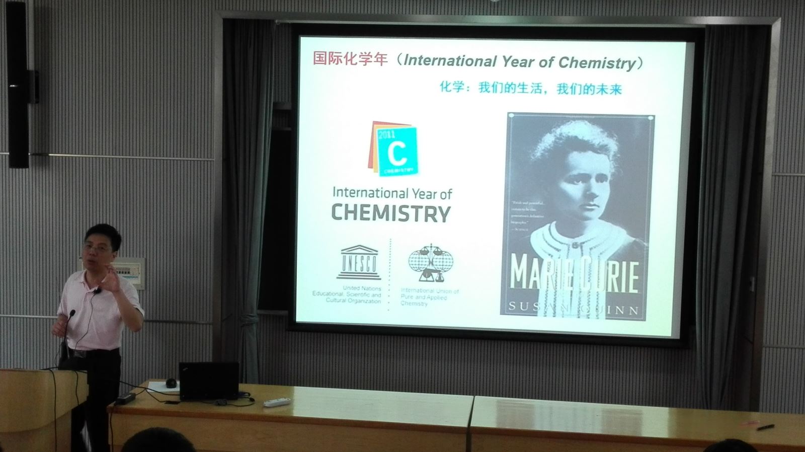 9月11日上午,化学系2015级新生-教授研讨课在化学馆开讲,赵国华教授为新生作了《化学——我们的生活,我们的未来》的主题报告,副系主任范丽岩主持,全体新生和班主任聆听了报告。