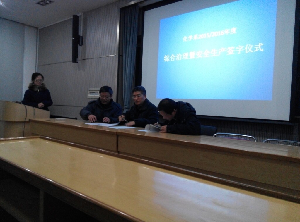 日前,化学系2015-2016年度综合治理暨安全生产签约仪式。会上,系党委书记王国强简要介绍了当前安全生产的形势,并就近期对全系各课题组与实验室安全卫生工作的检查情况进行了点评通报。王国强指出,当前各级领导对安全工作十分重视,作为学校安全防范重点单位,化学系历来重视安全工作,在当前形势下,化学系全体师生要继续严格按照上级有关安全稳定工作会议的精神和学校安全检查的要求,吸取近期其他高校安全事故的教训,落实安全工作,排查安全隐患并及时整改,落实安全措施,落实安全责任,有效防范各类生产安全事故和重特大火灾事故,确保寒假期间校园的安全和稳定,确保化学系师生工作学习环境长期安全稳定。