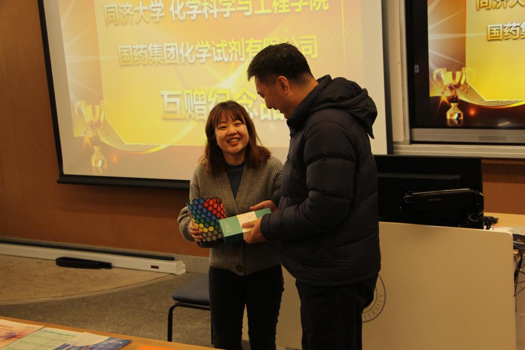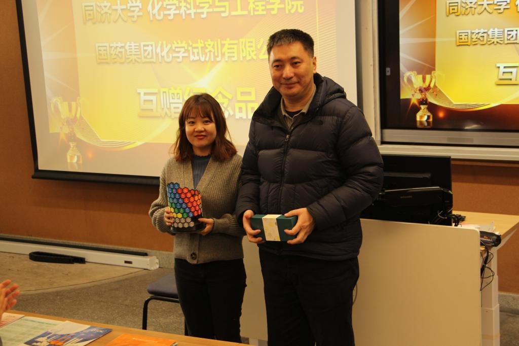 因受疫情防控影响,本次赛事的颁奖典礼推迟到2023年3月3日下午举行,典礼当天,由国药试剂公司为到场同学准备了精美礼品,化学化工公司党委书记曹同成老师对此次竞赛进行点评,同时邀请了国药试剂公司副总经理鲍仌炯女士、市场部经理吴晨雯女士致词,双方代表分别为一、二等奖获奖同学进行颁奖,并互赠纪念品。在典礼活动现场还进行了抽奖问答环节,再一次将同学们学化学、用化学、了解化学、感悟化学的热情点燃。