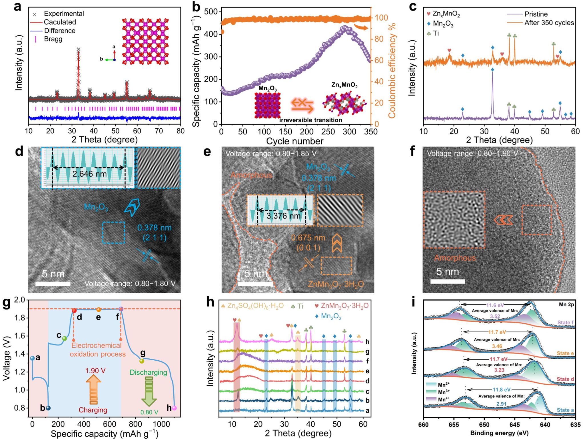 电化学研究表明,α-Mn2O3预相变后的非晶锰基材料具有更高的比容量(558 mAh g−1@100 mA g−1)、倍率性能和循环稳定性(5000次循环后容量保持率为95.85%)。