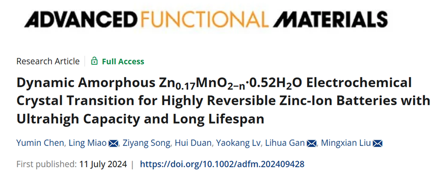 best365中国官方网站刘明贤、甘礼华教授团队长期致力于高效储能材料研究并应用于新能源电池开发,课题组近期通过电化学诱导预相变策略,解决了α-Mn2O3正极材料在循环过程中的不可逆相变问题,实现了非晶相Zn0.17MnO2−n·0.52H2O稳定和高度可逆的锌离子存储。相关成果以“Dynamic Amorphous Zn0.17MnO2−n·0.52H2O Electrochemical Crystal Transition for Highly Reversible Zinc-Ion Batteries with Ultrahigh Capacity and Long Lifespan”为题发表于国际知名期刊《先进功能材料》(Advanced Functional Materials)。