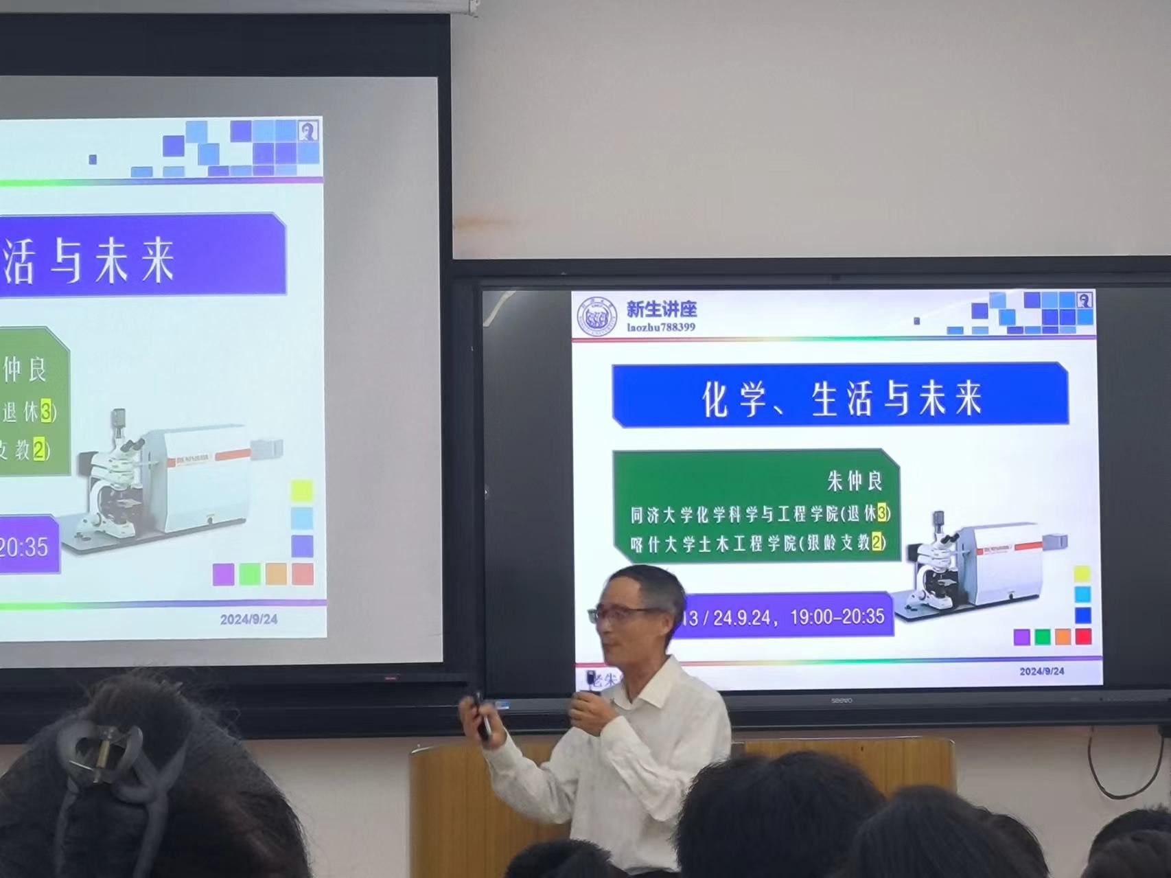 为了充分激发本科新生对化学实验的兴趣,并助力化学拔尖班新生之间的相互了解与团队建设,本学期best365中国官方网站策划开展“化学+”名师课堂系列讲座。9月24日晚,学院退休教师、目前在新疆喀什大学参与银龄计划支教的朱仲良教授返沪期间作为首位嘉宾应邀为2024级新生带来主题为“化学、生活与未来”的科普讲座。