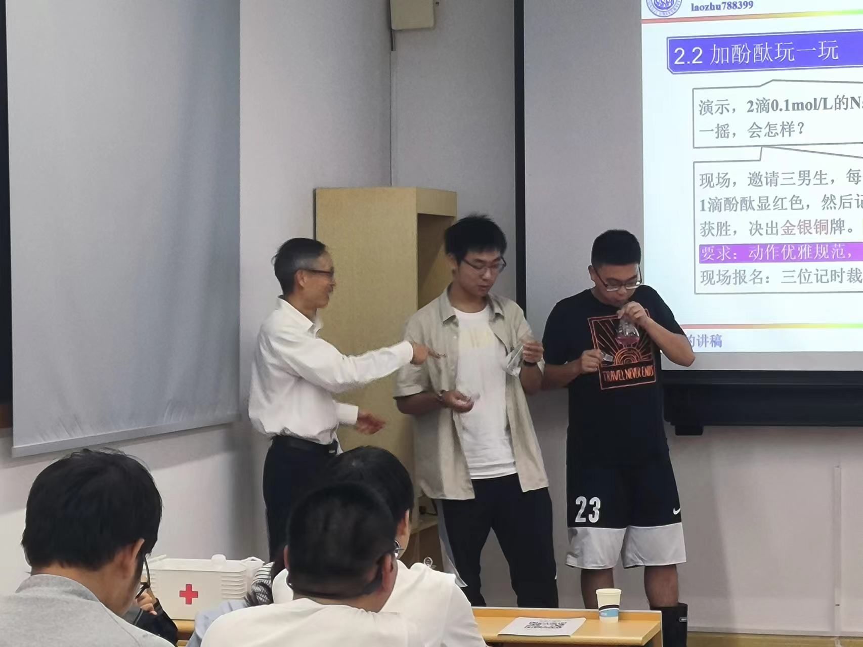 讲座上,朱老师风趣幽默的讲解让化学脱离无聊的方程式与化学式而变得趣味丛生。在欢笑与互动中,色彩的变幻展现在你我面前,让我在学到知识的同时又放松了身心。我有幸上台参与了互动,以吹气的方式通入二氧化碳,使液体的碱性减弱以致指示剂变色。简易的实验却能揭示化学原理,让我不得不感叹老师的知识渊博和善于教学。最后还有学长的知识经验分享,让我对适应大学新生入学有了更好的方法。