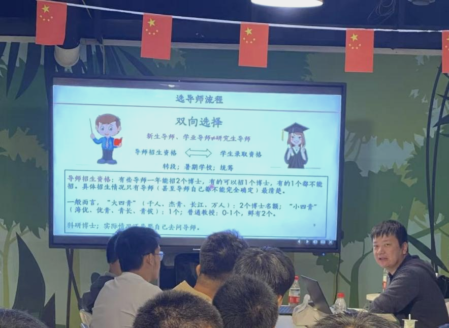 杨泽鹏深入浅出地讲述了员工选导师的流程,并表示导师选择是双向的,分析了新生导师、学业导师与研究生导师之间存在较大差异。此外,他特别指出,了解导师的招生名额情况是选择导师时的一个关键点,因为这直接影响到导师能够投入的时间和资源。因此,同学们应当提前做好功课,了解意向导师的研究方向和招生情况。