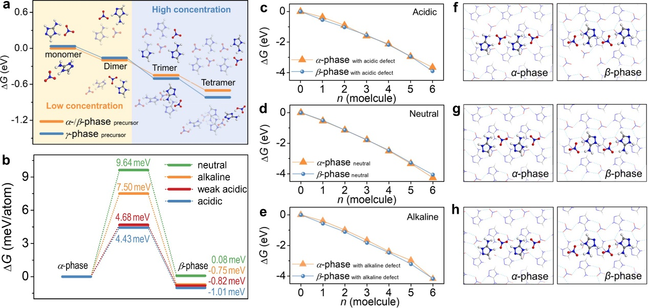 研究团队还运用X射线单晶衍射技术与第一性原理计算的多尺度研究方法,深入探讨并阐明了溶液pH值对[C2H5N4]和[NO3]基元间次级键相互作用取向的调控机制。次级键相互作用方向主导着晶体基元的空间堆积模式——通过精准调控这些弱相互作用网络,可定向诱导生成非中心对称或中心对称的硝酸盐超分子晶型。在特定的pH溶液中,二维α相晶体通过氢键网络重构发生向β相的不可逆相变。两种非心相晶型显示出显著不同的倍频响应和双折射,其归因于pH诱导形成的不同二维氢键层堆积方式。实验研究显示,α相和β相表现出不同的倍频响应((3.5 × KH2PO4 (KDP)) (α相)和1.0 × KDP @ 1064 nm (β相))和双折射(0.069 (α相)和0.046 (β相) @ 546 nm)。该工作通过建立“次级相互作用-晶体对称性-光学响应”的定量构效关系,为超分子非线性光学材料的多晶型定向设计提供了理论指导框架,同时对于创制研发新型高性能日盲紫外非线性光学晶体具有重要的科学意义和示范作用。