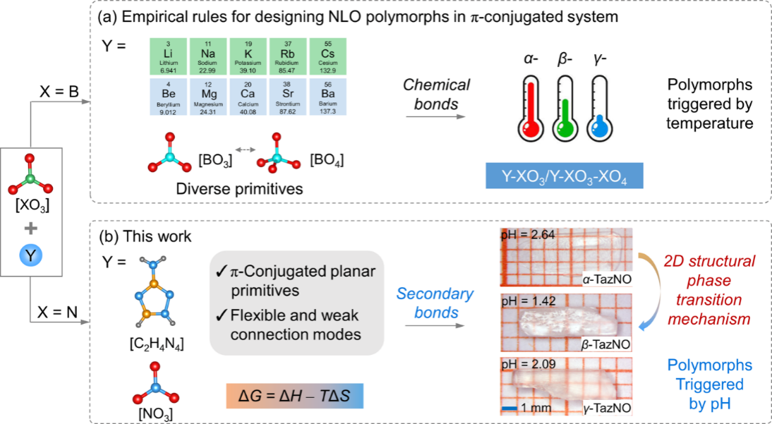 在紫外可调谐激光技术领域,基于二次谐波产生效应的二阶非线性光学晶体材料因其在超高分辨率光刻、生物医学成像及精密微纳加工等战略产业中的核心作用而备受关注。这类材料的功能实现严格依赖于非中心对称晶体结构的确立。然而,非中心对称晶型的可控合成长期受限于结构基元间的复杂相互作用。如何突破热力学稳定相限制、定向捕获具有特定非线性光学活性的晶体材料,仍是当前非线性光学晶体材料领域面临的一个极富挑战的科学与技术难题。
