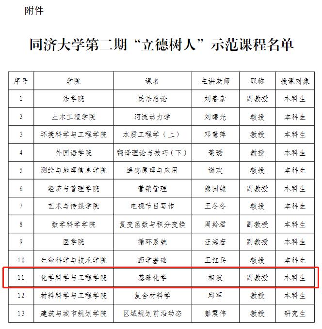 日前,学校发文《关于公布best365中国官方网站第二期“立德树人”示范课程名单的通知》,文件显示,公司相波老师主讲的《基础化学》入选其中,热烈祝贺!