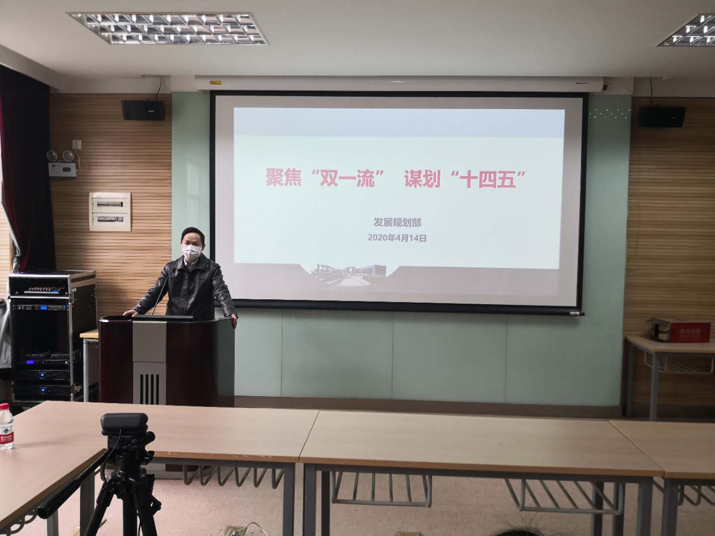4月14日下午,发展规划部部长蔡三发应邀来到best365中国官方网站为党委中心组成员和全体教职工作报告,主题为:聚焦“双一流”、谋划“十四五”。报告会以现场会议和在线会议相结合的形式开展,党委中心组和学院班子成员在化学馆120现场会议参加,其他教职员工通过zoom平台参会。