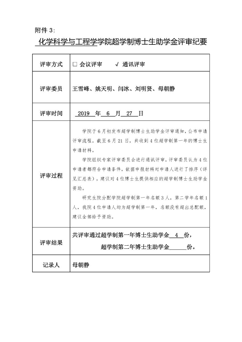 按照研究生院通知要求,学院于6月初发布超学制博士生助学金评审通知,公布申请评审流程。截至6月21日,共收到4位超学制第一年的博士生申请材料。根据有关要求,学院组织评审委员会开展通讯评审,现将结果公示如下。