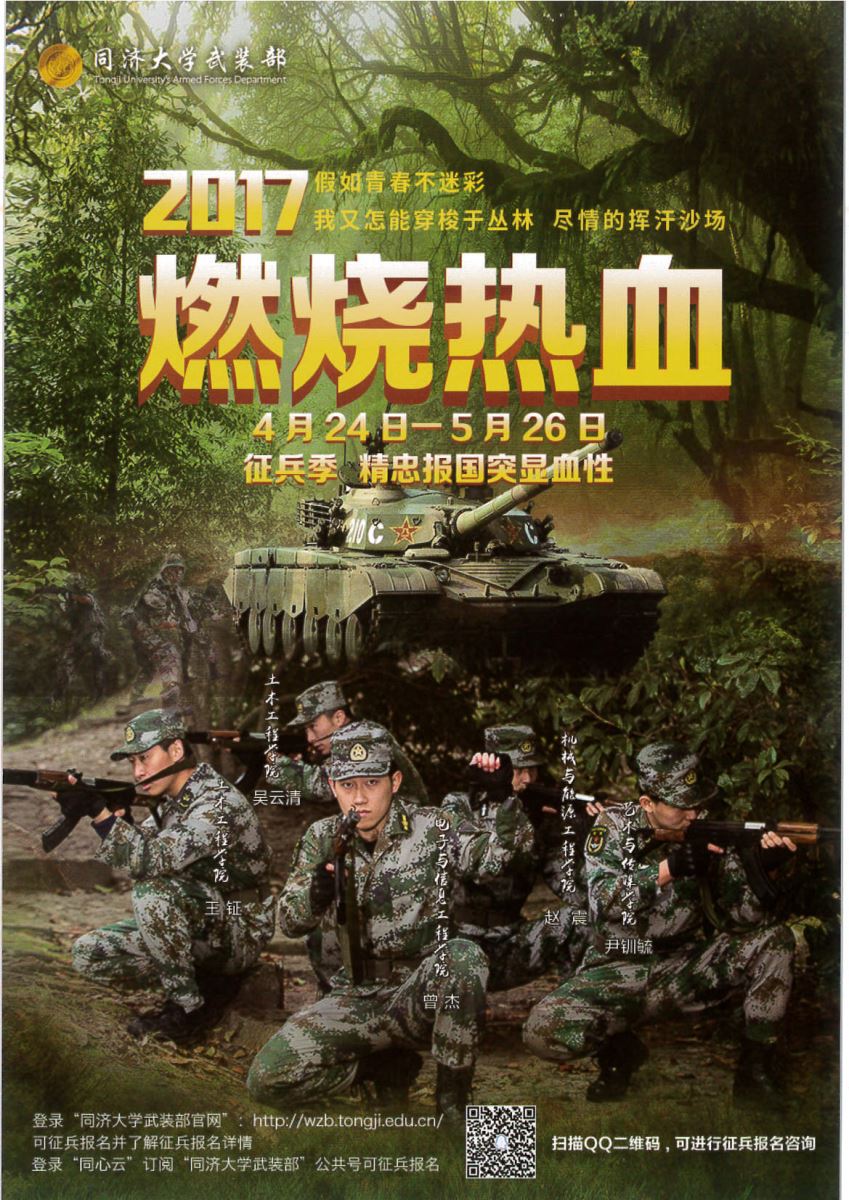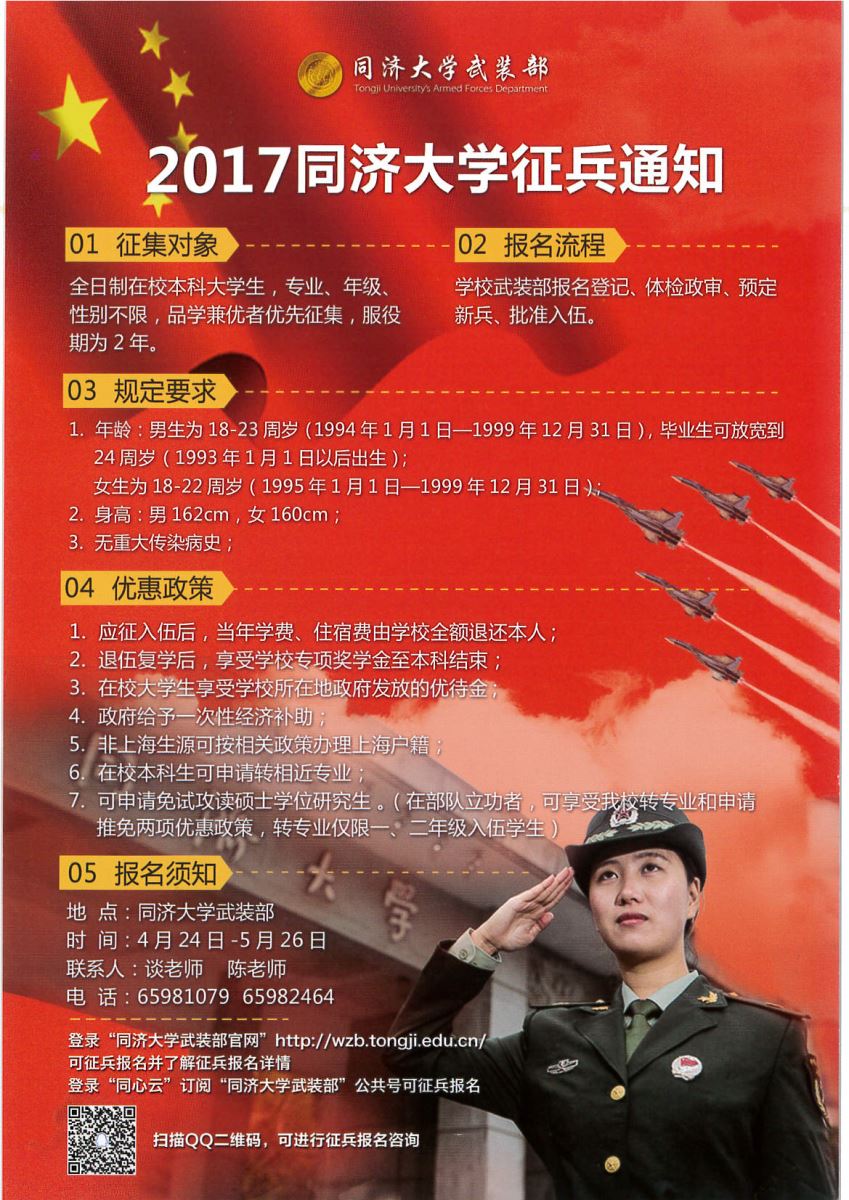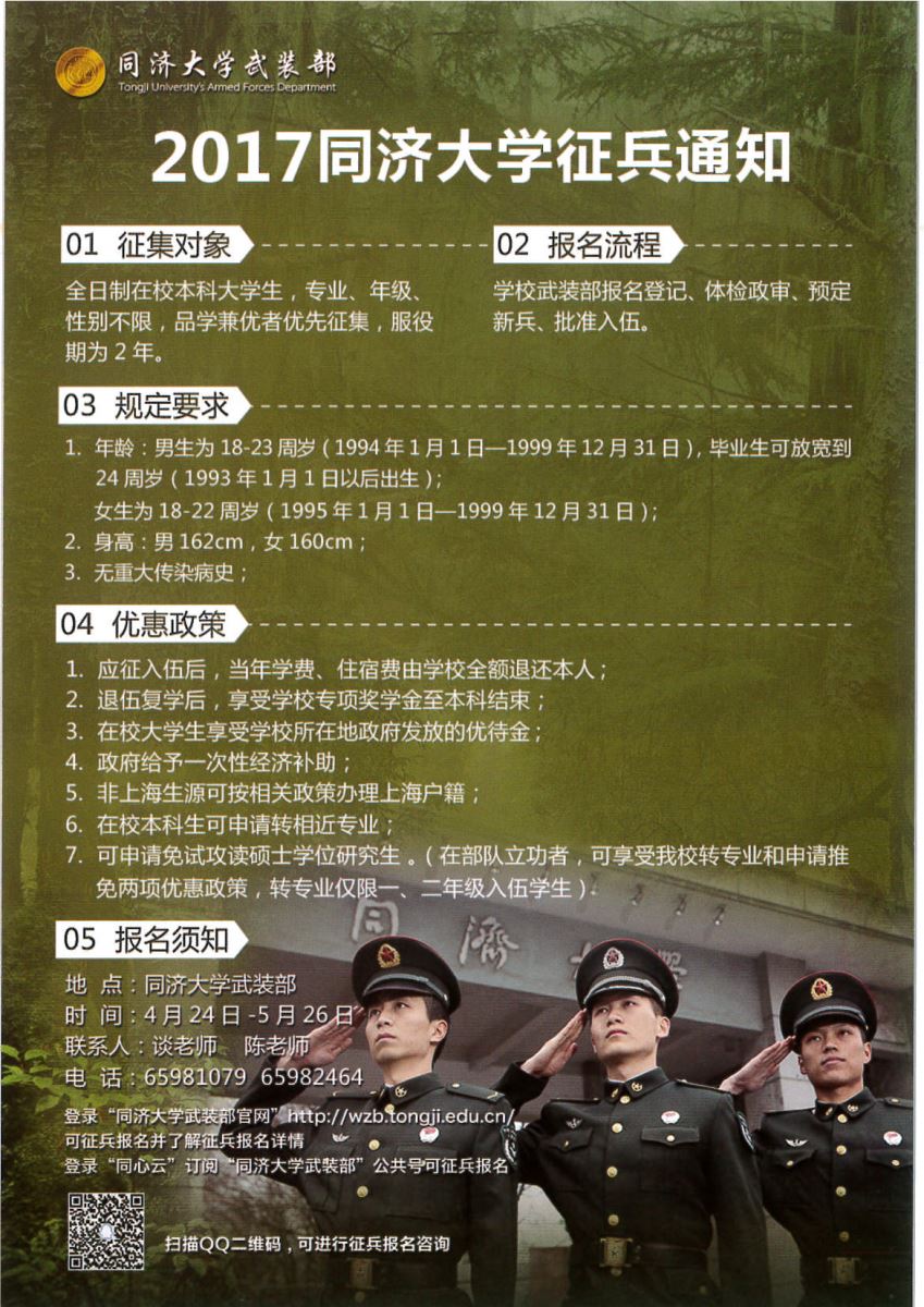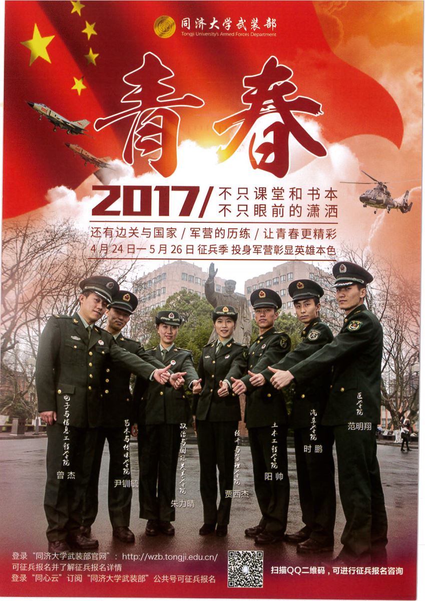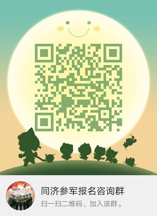 2017年征兵工作现已启动,详情请看后附宣传图片。如有意向参军入伍,可以进入同济参军报名咨询群(见下图)直接了解相关情况。如确定报名参军也请与学院征兵工作咨询联系人联系了解详细政策和相关工作流程。