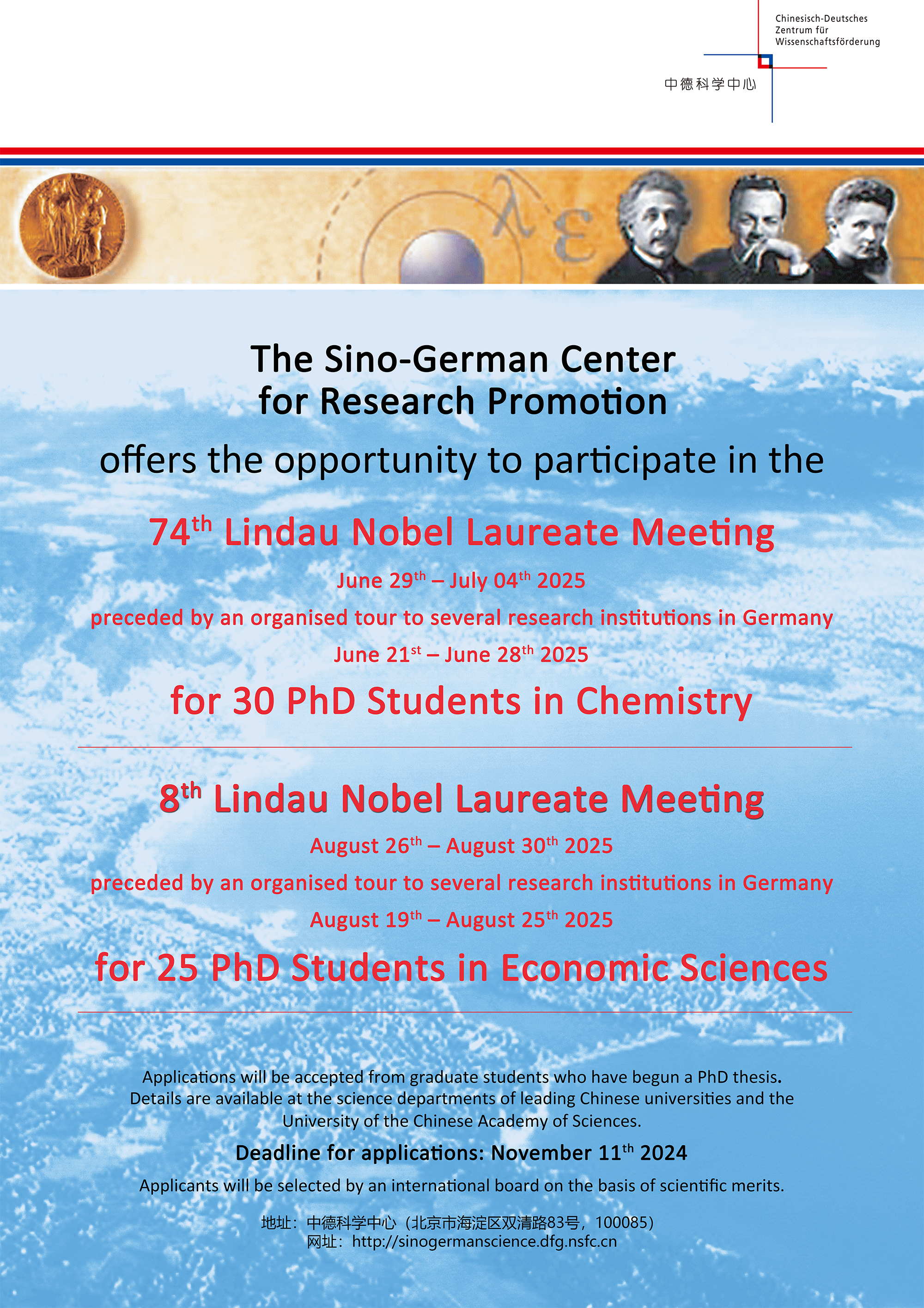 中德科学基金研究交流中心近日发布了《关于挑选优秀博士生出席德国诺贝尔奖获得者大会的通知》,详见中德科学基金研究交流中心网站(http://sinogermanscience.dfg.nsfc.cn),满足条件有意向申报的博士研究生请于11月1日(周五)12:00前将申报材料发送至liuyonghuan@tongji.edu.cn,邮件主题注明:出席德国诺贝尔奖获得者大会申报材料。