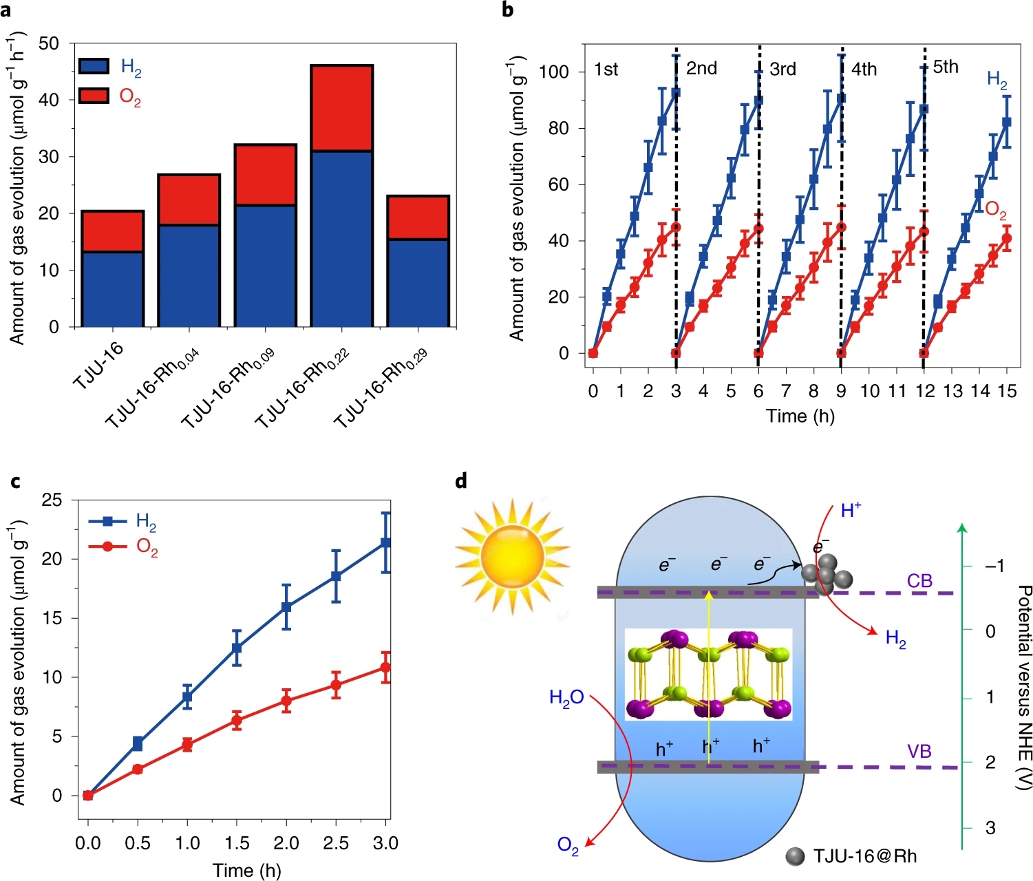 Recently, Fei group have reported a visible-light-responsive organolead iodide crystalline material [Pb8I8(H2O)3]8+ (TJU-16). Both experimental and theoretical studies indicate the high chemical stability of TJU-16 arise from the high-coordinate iodide anions located in the inner spaces of each cationic layer. The material not only has a conduction band and valence band straddling the water-splitting redox potential, but also has a narrow bandgap of 2.74 eV. Hall effect measurement and transient-state photoluminescence study indicate long photocarrier diffusion distance of 0.4~1.4 μm, superior to many metal oxide semiconductors. Under simulated solar illumination, the material steadily performs photocatalytic overall water splitting without use of any sacrificial agent or co-catalyst. The sustained photocatalytic activity is 2.4-fold enhanced when combined with 0.22 wt.‰ Rh co-catalyst, up to 5 cycles and 57 h continuous irradiation. Even decreasing the illumination intensity to 20 mW cm-2, TJU-16 still catalyzes the water splitting with a calculated overall solar-to-hydrogen conversion efficiency of 0.014%.
