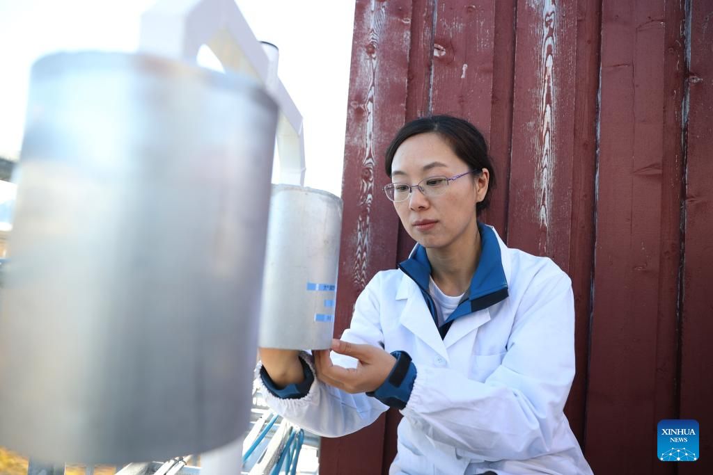 Zhao Hongying, a member of the Chinese Arctic expedition team, checks a sampling device to capture microplastics from the air at China's Arctic Yellow River Station in Ny-Alesund, Svalbard, Norway, on June 21, 2024. (Xinhua/Zhao Dingzhe)