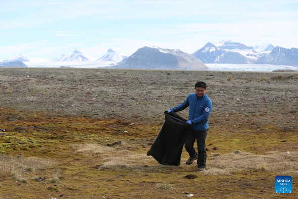 Chinese scientist Hu Zhengyi attends the annual litter-cleaning campaign in Ny-Alesund, Svalbard, Norway, on June 21, 2024. (Xinhua/Zhao Dingzhe)