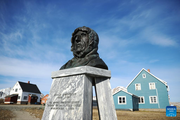 A monument to Norwegian explorer Roald Amundsen is seen in Ny-Alesund, Svalbard, Norway, on June 21, 2024. (Xinhua/Zhao Dingzhe)