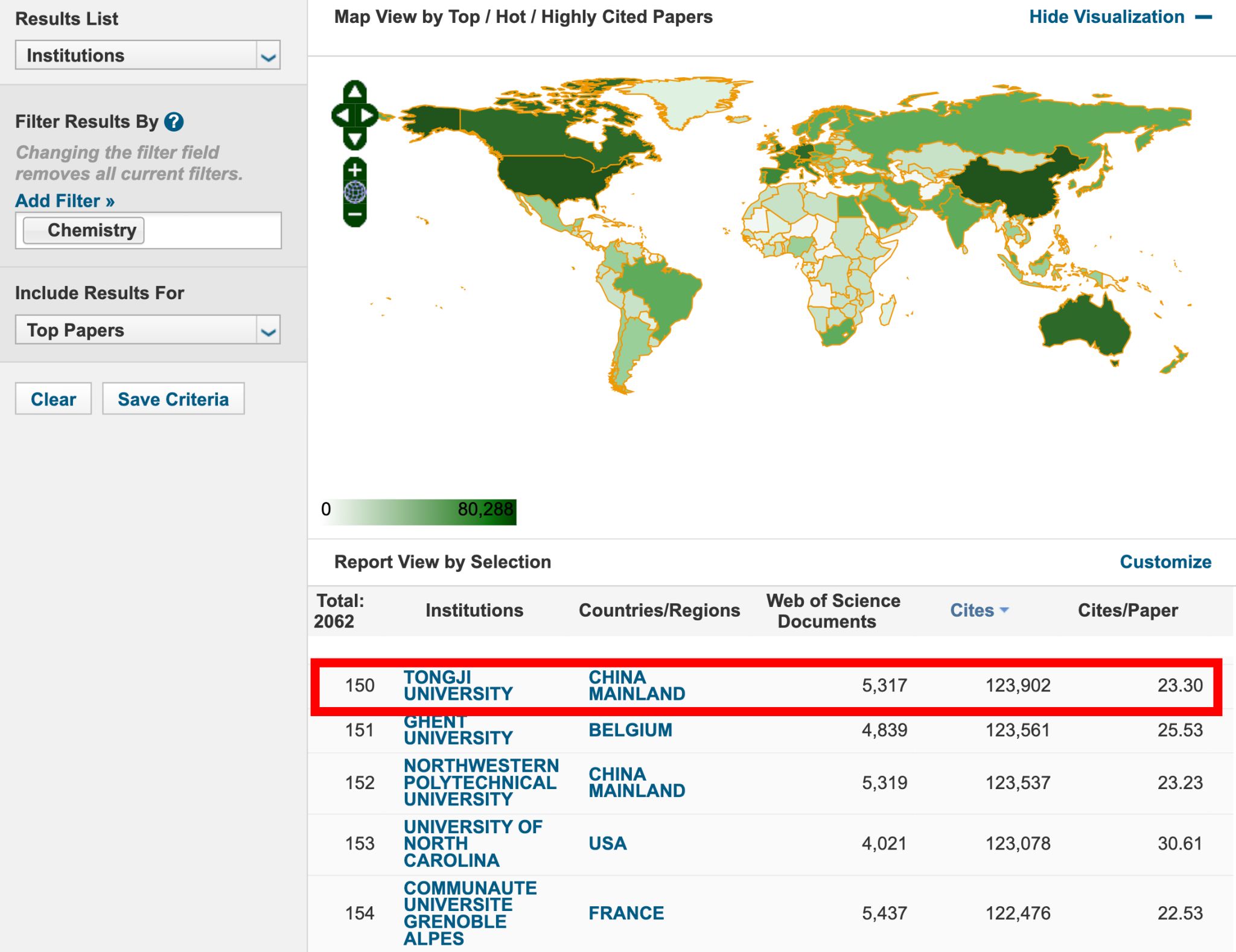 The data shows that Tongji University's (TJU) chemistry discipline continues to maintain its international ranking at 150, up 2 places from two months ago, entering the top 0.727‰ of the ESI ranking.