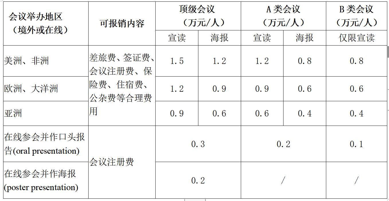 本基金2022年度主要用于资助员工在线参加列入《best365中国官方网站各院系(学科)研究生重要国际学术会议目录》的国际学术会议所产生的会议注册费用。会议资助额度上限将按照会议等级而定,具体额度详见下表: