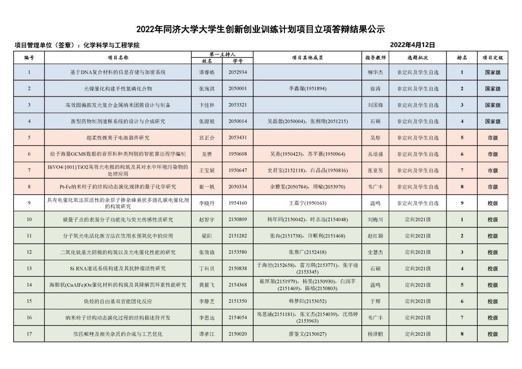 2022年老员工创新创业训练计划项目立项答辩日前在线上完成。答辩分成“面向2021级定向项目”和“非定向及员工自选项目”两组进行,参加立项申请答辩的17个项目均准予立项,并根据学校分配的各级别项目名额对项目进行了定级,现将结果公示如下。如对结果有异议,请联系刘老师,liuyf@tongji.edu.cn。公示期:2022年4月9日 - 4月15日。