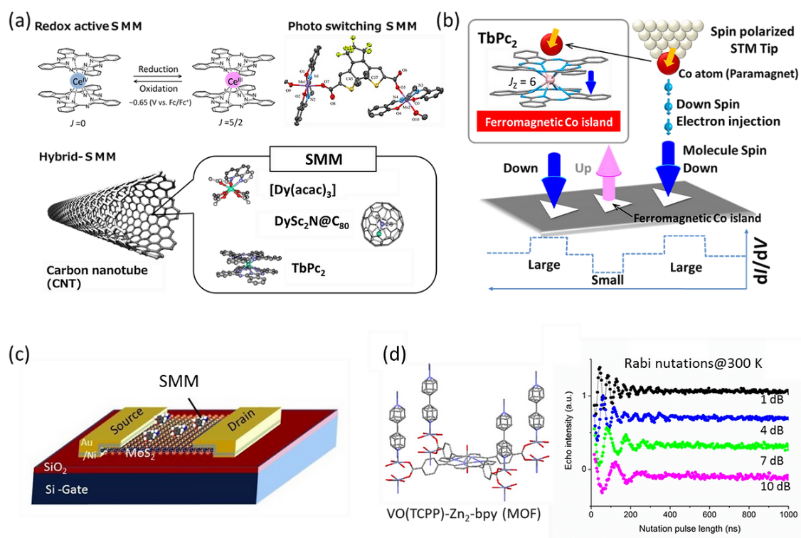 具体来说我们的工作分为以下几个部分: (a) 用于纳米自旋电子器件的高性能 SMM 的高效合成方法和功能评估,我们将合成具有电化学/光学开关功能的 SMM,并利用磁性测量和光谱技术阐明其功能。(b) 开发 SMM 中自旋的操作和控制方法,为了操作和控制 SMM 中的自旋,我们旨在通过 STM/STS 利用自旋极化隧道电流进行电导分析,从而检测自旋方向(↑ - ↓)。通过电流检测一个 SMM 分子的磁化状态,并从自旋极化电流的测量中验证 SMM 是否可以磁记录信息。此外,还可以阐明其机制。(c) 理解和阐明导电 SMM 的自旋依赖传输现象,作为导电 SMM 自旋相关输运现象的一部分,我们将阐明局部 f 自旋与传导载流子之间 π-f 相互作用的影响以及 f 离子依赖性。将 SMM 置于场效应晶体管器件的栅极部分,在自旋状态下控制源极和漏极之间的电流,并阐明其机理。(d) 利用 SMM 的自组装开发量子位操作和控制方法,我们的目标是利用 SMM 的自组装延长相干时间,并阐明与分子聚集形态和维度的相关性。我们将使用拥有脉冲EPR对相干时间进行详细研究。