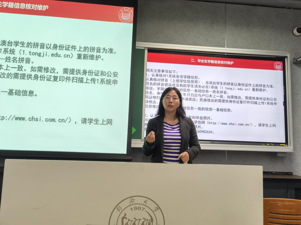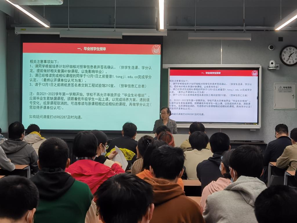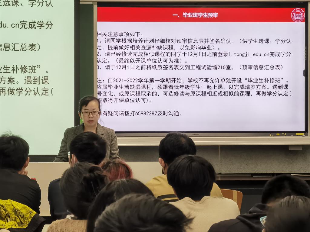 首先,学院副经理刘梅川向同学们介绍有关毕业的两项工作。一、毕业班员工预审,根据培养计划仔细核对预审信息表,并完成各类课程认定;二、毕业生学籍信息核对维护,核对1系统各项学籍信息、核对学信网学籍信息和毕业照片。她提醒同学们相关工作非常重要,关系到同学们毕业事宜,请同学们务必重视,有困难、有问题随时联系相关负责老师。