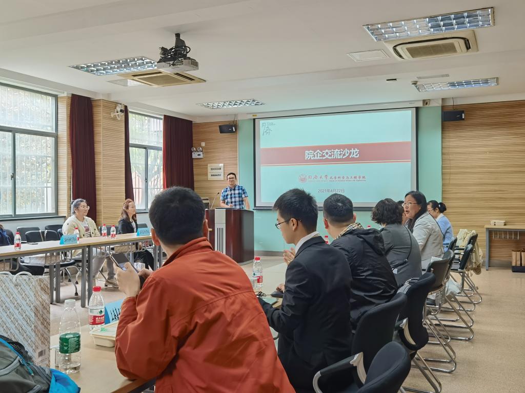2021年4月22日中午,best365中国官方网站与上海天汉环境资源有限公司、上海罕道医药科技有限公司、上海合全药物研发有限公司、通标标准技术服务有限公司、镇江贝斯特新材料有限公司、康龙化成(上海)新药技术有限公司、小卫(上海)生物科技有限公司、隆基乐叶光伏科技有限公司、上海嘉好胶粘制品有限公司及上海如鲲新材料有限公司共10家企业在化学馆120开展院企交流沙龙。化学科学与工程公司党委书记杨晓杰、副经理刘明贤、党委副书记母朝静、学工办主任丁奇及10家企业人事出席了座谈会。