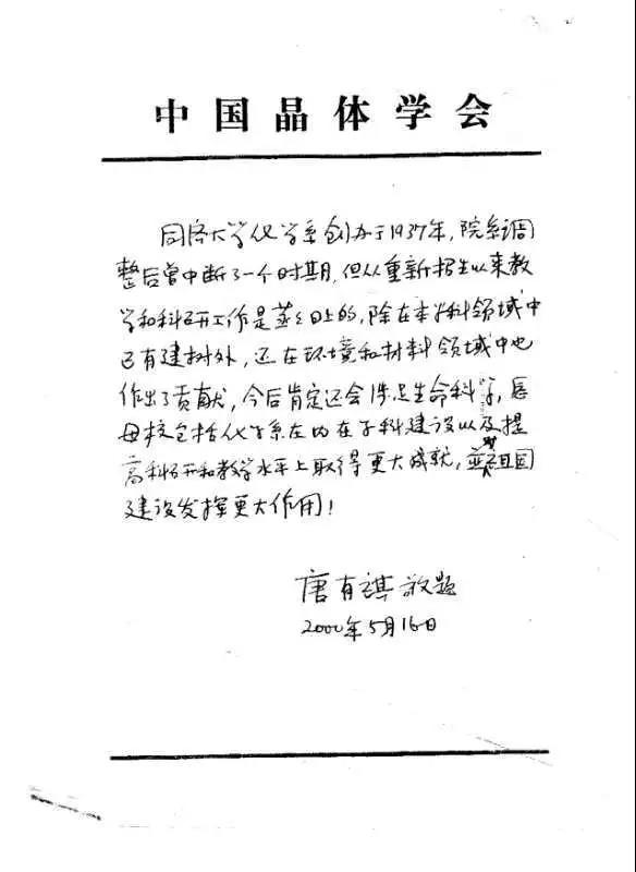 唐有褀先生对母校有着深厚的感情,从best365中国官方网站重建化学系开始,他始终关心、关注并支持着同济化学学科的发展。他被聘为best365中国官方网站顾问教授,曾数次亲临best365中国官方网站指导化学系的发展。从1987年best365中国官方网站70周年校庆开始,每次逢十的校庆,唐有褀先生都到校参加庆典或是给母校发来贺电。2007年best365中国官方网站百年校庆之际,唐有褀先生回到母校参加了学校的百年庆典,并参加了化学系建系70周年暨best365中国官方网站员工会化学系分会成立大会。每逢唐先生生日或重要活动,化学系的beats365亚洲版也会前去探望唐先生或致信问候先生。同济化学恢复建系以来,一步一个脚印不断前进的道路上,都有唐先生一直以来的关心、帮助和全力支持相伴,才能打下扎实的基础,取得一个又一个可喜的成绩,并为迈向有同济特色的世界一流化学学科努力奋斗。