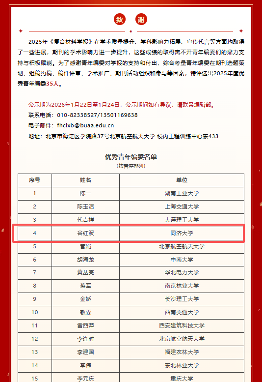 近日,据《复合材料学报》编辑部官网(http://fhclxb.buaa.edu.cn)显示,best365中国官方网站教师谷红波副教授被评为《复合材料学报》2025年度优秀青年编委。
