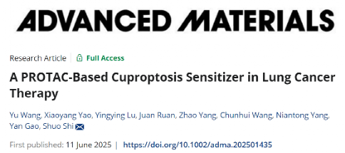 癌细胞经常表现出对传统细胞凋亡途径的抵抗,这对实现理想的癌症治疗结果提出了重大挑战。铜死亡作为一种独立于传统细胞凋亡机制的新型细胞死亡形式,为癌症治疗开辟了新的途径。这种依赖铜离子积累和线粒体呼吸的过程通过促进脂酰化蛋白的异常寡聚化和降低三羧酸(TCA)循环中的铁硫(Fe-S)簇蛋白水平来诱导细胞死亡。然而,细胞内的游离铜离子可被显著表达的谷胱甘肽(GSH, 1-10 mM)清除,而谷胱甘肽作为铜离子螯合剂,削弱了铜死亡的效果。此外,癌细胞更倾向于糖酵解(Warburg效应)而不是线粒体呼吸来产生中间代谢物和能量,导致铜死亡的效果不理想。针对这一难题,石硕教授团队创新性的构建了一种基于蛋白水解靶向嵌合体(PROTAC)的铜死亡增敏剂用于肺癌治疗,为铜死亡增敏提供了新的策略。相关研究成果“A PROTAC-Based Cuproptosis Sensitizer in Lung Cancer Therapy”发表于国际知名期刊Advanced Materials。