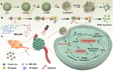 在这项研究中,研究人员构建了一种基于PROTAC的铜死亡增敏剂,通过GSH的双重消耗和促进线粒体呼吸来增效铜死亡,同时与细胞凋亡协同作用,有效治疗肺癌。该增敏剂不仅可以通过铜离子诱导铜死亡和活性氧的产生,还可以通过泛素-蛋白酶体系统调节肿瘤细胞中p53蛋白的表达,从而实现内源性GSH的耗损和糖酵解向线粒体呼吸的转变,使癌细胞对铜死亡更加敏感。重要的是,体外和体内实验已经证实该增敏剂可以有效靶向肿瘤细胞,并通过铜死亡和细胞凋亡抑制肿瘤生长,显示出良好的治疗效果。这种新型的基于PROTAC的铜死亡增敏剂有效地克服了铜死亡的局限性,为肺癌有效治疗提供了新的希望。
