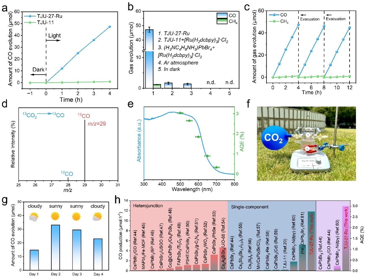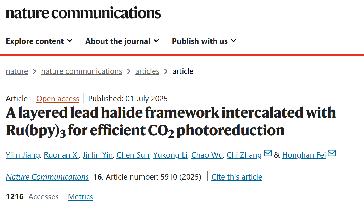 近年来,best365中国官方网站费泓涵教授团队聚焦于配位驱动策略构筑卤化铅框架(Nat. Catal. 2020, 3, 1027;Nat. Commun. 2022, 13, 4592;Acc. Chem. Res. 2023, 56, 452)。与传统卤化铅杂化材料的离子结构不同,这种配位组装策略赋予材料较高的本征稳定性,可在宽pH范围甚至沸水条件下保持结构完整性。然而,羧酸配体导致卤化铅单元空间分离,导致材料较宽的带隙和较窄的吸收波长覆盖的问题。针对这一难题,本团队提出了一种共价插层策略,将光敏剂[Ru(bpy)₃]⟡⁺引入层状卤化铅骨架,该杂化材料实现了宽可见光吸收以及从[Ru(bpy)₃]⟡⁺到卤化铅层的高效光诱导电荷转移,从而在500 nm波长下实现了CO₂光还原为CO的表观量子效率达3.0%,性能超过了所有已报道的有机-无机杂化卤化铅光催化剂,相关研究成果发表在化学领域权威期刊《自然通讯》(Nature Communications, 16, 5910)上。