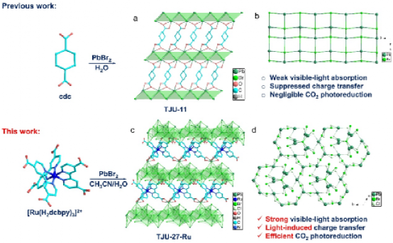 卤化铅杂化材料因其出色的结构可调性和光物理性质近年来备受关注。三维卤化铅杂化材料具有优异的物理化学性质,但存在固有的不稳定性,而二维层状卤化铅具有更好的环境稳定性,但其强烈的激子束缚限制了有效的电荷输运。为解决这一限制,将高效光敏基团(如[Ru(bpy)₃]⟡⁺)集成至卤化铅框架中成为一种有效策略。然而,如何通过晶体工程实现[Ru(bpy)₃]⟡⁺功能化卤化铅,尤其是通过配位组装达成高效光诱导电荷转移,仍是巨大挑战。