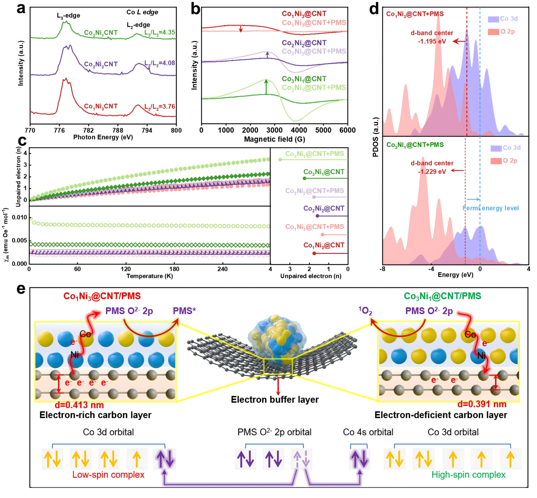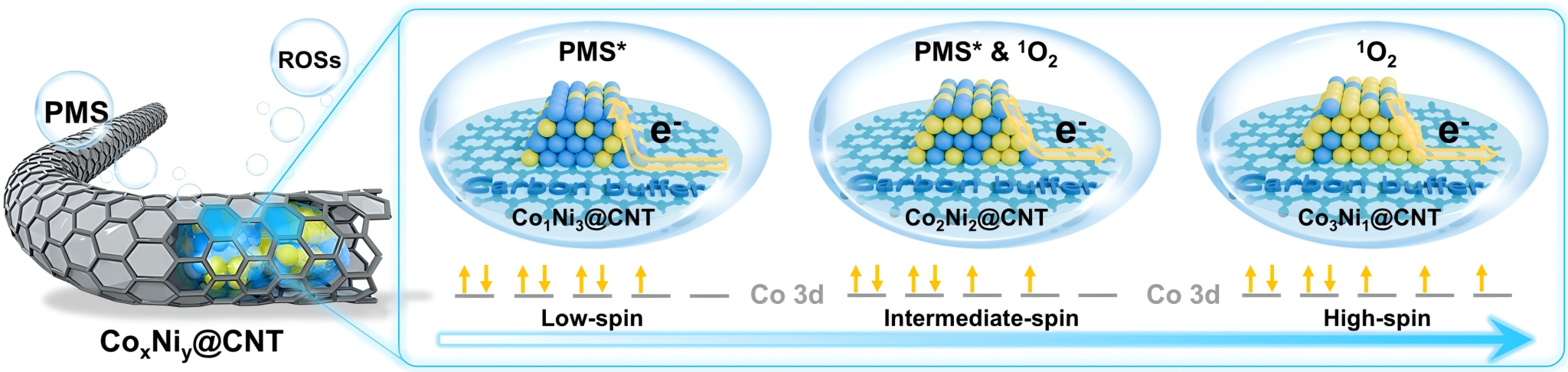 通过多种原位光谱/波谱表征技术结合DFT计算,该研究深入揭示了非自由基物种产生机理。Co3Ni1@CNT呈高自旋态(S=3/2),Co2Ni2@CNT为中自旋态(S=1),Co1Ni3@CNT为低自旋态(S=1/2)。在活化过PMS时,PMS中O 2p轨道的成对电子会动态填充Co的空轨道,形成具有成对/未成对电子的配位的Co-O物种。同时,碳纳米管的纳米碳层可以作为电子缓冲层来调整CoxNiy中心的电子密度:宽间距碳层(0.413 nm)作为富电子缓冲层,可向低自旋Co补充电子,稳定Co-O从而促进PMS*的形成;窄间距碳层(0.370 nm)作为缺电子缓冲层,可接受高自旋Co多余电子,促使Co-O断裂以生成1O2;中间距碳层(0.391 nm)则兼具两者特性。