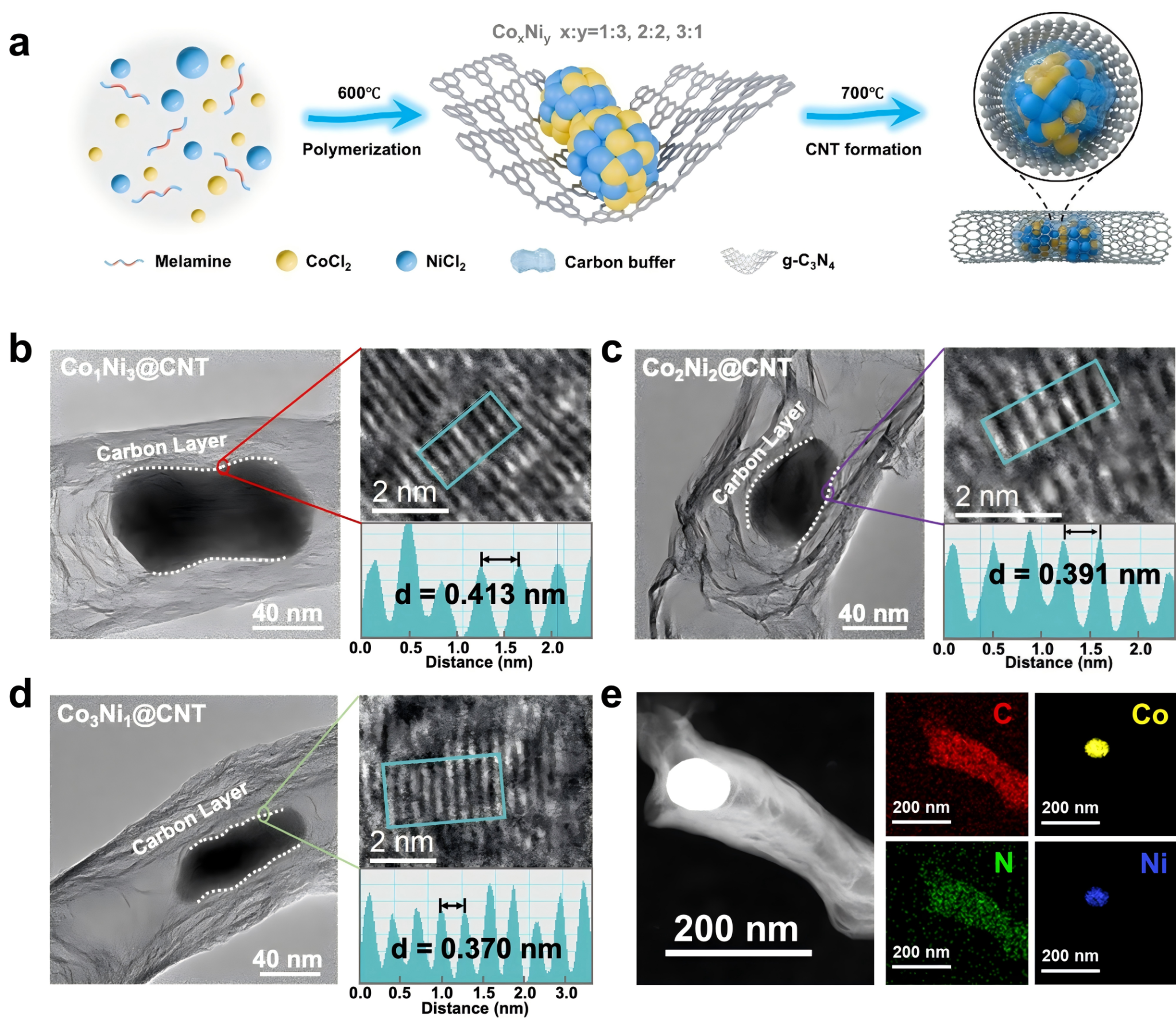 该研究通过热解法制备了不同Co/Ni原子比的CoxNiy@CNT催化剂。研究发现,Co/Ni比例的变化能精准调控碳纳米层的晶格间距,这是由于钴镍比例差异影响了碳扩散速率。CoxNiy@CNT中的Co和Ni呈近零价态,根据配位键确认纳米颗粒为面心立方晶格的CoNi合金,其中Co1Ni3、Co2Ni2和Co3Ni1的Co/Ni配位数分别为1/3、2/2和3/1。