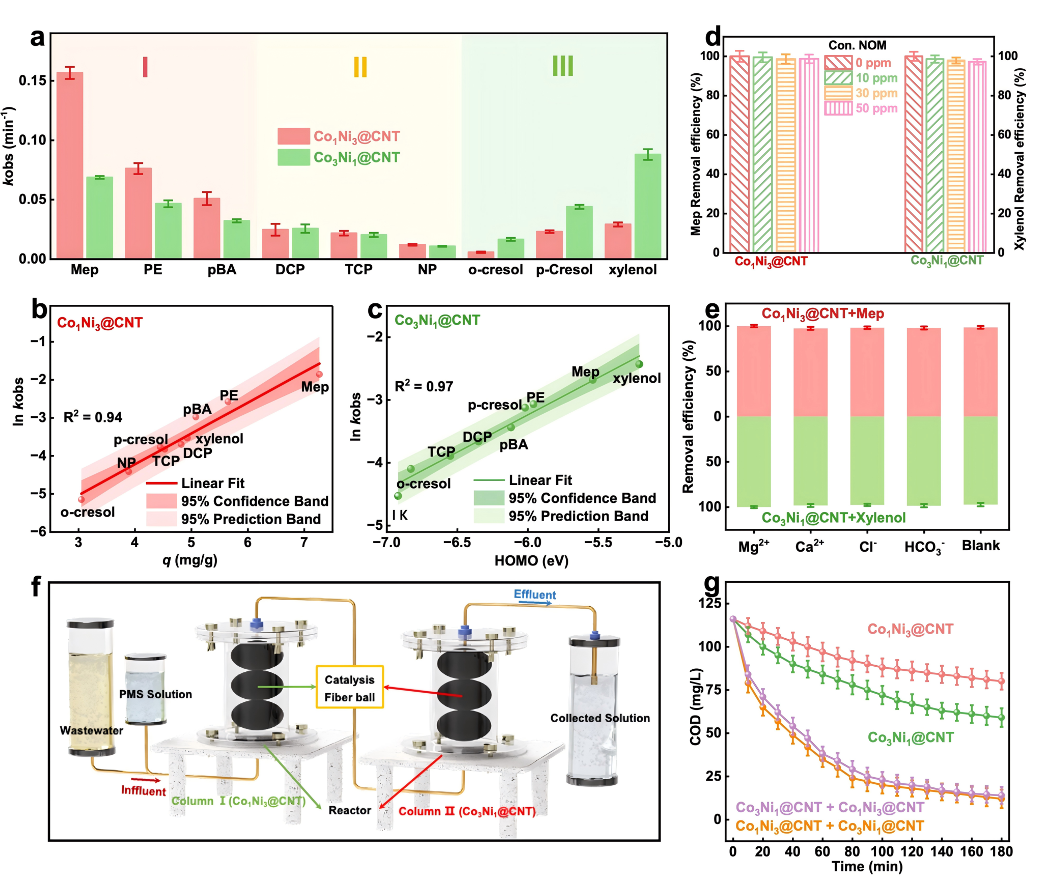 研究还揭示了Co1Ni3@CNT活化PMS形成的PMS*对污染物的降解效率主要取决于其吸附能力;而Co3Ni1@CNT活化PMS产生的1O2*对污染物的降解效率与其电子得失能力呈现正相关。基于这一污染物选择性降解的规律,构建了Co1Ni3@CNT和Co3Ni1@CNT催化剂的串联固定床工艺,180分钟实现医院废水87.9%-89.6的COD去除率。