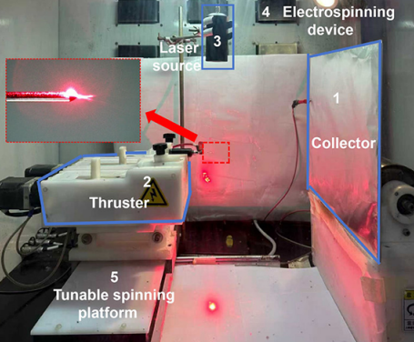 静电纺丝(electrospinning)是一项传统的纤维制造技术,其源头可追溯到1600年,但是直到1934年才设计出装置并实现聚合物纤维的静电纺丝制备;再到1960’s才揭示其中的关键现象“泰勒锥”;进入1990’s以后随着纳米科技的发展静电纺丝技术也终于走上了快车道。然而,在静电纺丝发展过程中,人们主要是通过调整仪器设备参数、实验环境参数、前驱液参数、乃至针头改造等方式来实现纤维纺丝预期目标;而对于高压静电场中的泰勒锥超快作用过程一直无人问津,也无从入手。该论文首次将低功率红色激光束与超高压静电场中植入了蚕丝和藕茎两级仿生的泰勒锥超快反应前驱液相耦合,使含有碳纳米管的PAN前驱液在泰勒锥中的飞行组装温度和粘度等参数得以自由调控,从而创建了一套适用于各种高聚物复合纤维制备的“激光-静电场耦合仿生纺丝”新技术(LECBS),其基本装置如下: