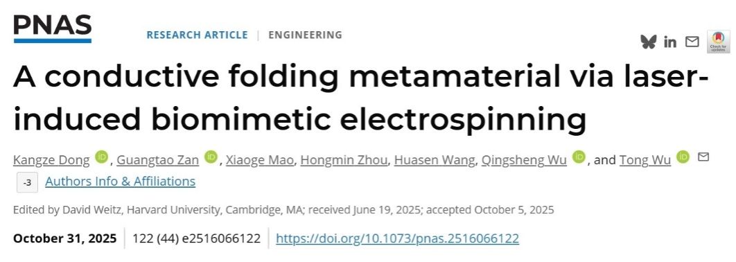超材料(metamaterial)是一类通过人工结构设计、实现自然界不存在的超常物理性质的人造复合材料,而且它们的这种特性均源自于其精巧设计的微观结构,而非材料本身的化学组成。“超材料”的概念最早产生于上世纪60年代,但受限于当时的制备技术,该理论沉寂了三十多年,直到世纪之交才首次实现其实验室制备,诞生了世界第一个超材料:负折射超材料。此后,隐身斗篷、光子晶体、负泊松比等十多种性能各异的超材料被陆续发明。由于超材料具有一些独特的性质和异乎寻常的应用场景,故被Science杂志评为21世纪影响人类的十大科技突破之一,并且成为近几年的诺贝尔奖风向标。然而,至今却仍未在“导电折叠超材料(CFMs)”方面获得突破。其主要原因在于,本征导电材料不可(真)折叠属性以及材料的折叠与导电相互矛盾本质,以至于尚没有一种合适的方法来设计制备它。为此,best365中国官方网站吴彤研究员领衔的纳米化学科研团队通过创建“激光-静电场耦合仿生纺丝(LECBS)”技术破解了这一难题。研究成果以“A conductive folding metamaterial via laser- induced biomimetic electrospinning”为题发表于国际顶级综合性学术期刊PNAS(Proceedings of the National Academy of Sciences of the United States of America)即《美国国家科学院院刊》。