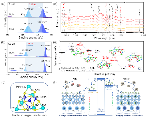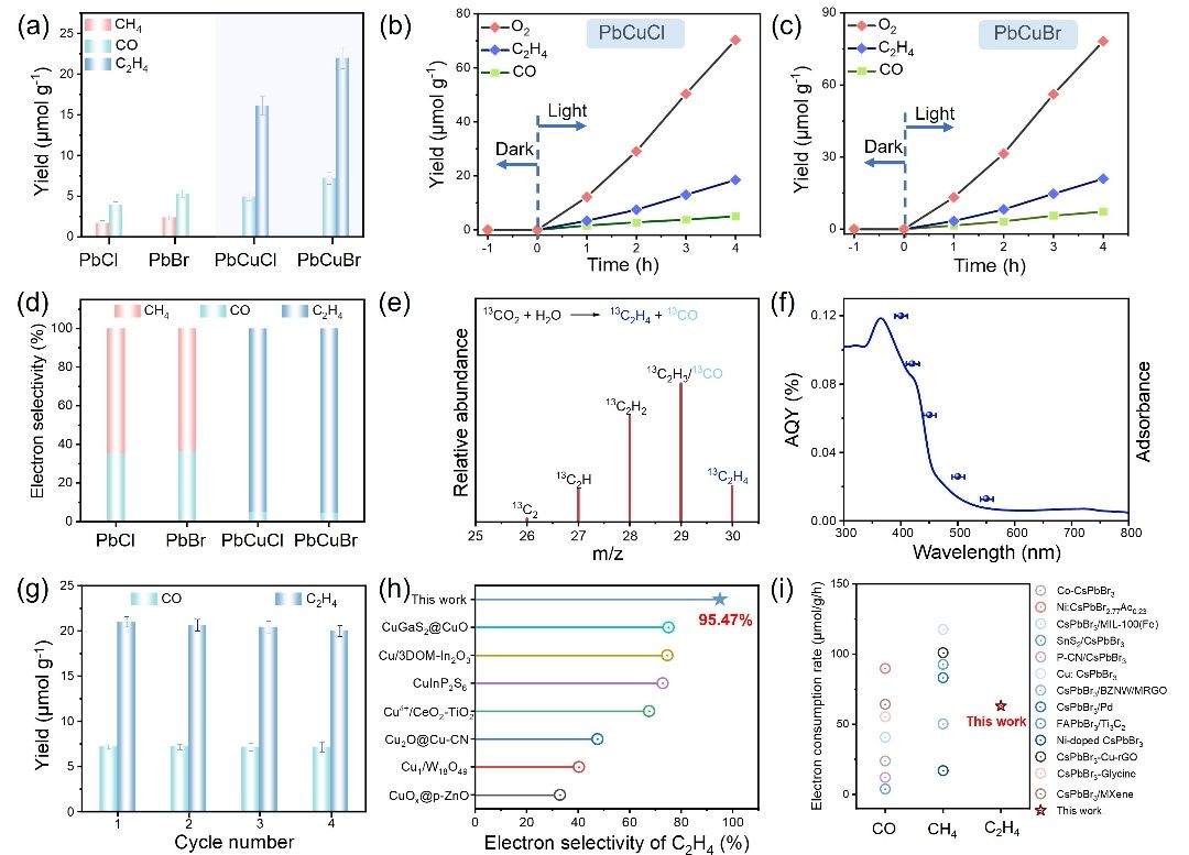 这一合成策略不仅丰富了三维金属卤化物的结构类型,[Cu4X4]簇的引入还显著提升了材料的载流子迁移效率,有效抑制了光生电子-空穴的复合。此外,新构筑的双金属框架中形成了本征电荷极化的不对称Cuᴵ–X–Pbᴵᴵ卤素桥联异双金属位点,为CO2还原反应营造了有利的催化微环境。光催化性能测试表明,该材料能够在纯水体系下能高效将CO2还原为乙烯,并展现出优异的C2产物选择性。机理研究揭示,不对称的Cuᴵ–X–Pbᴵᴵ活性位点可有效稳定*COCOH关键反应中间体,促进C–C偶联过程,是实现高选择性生成C2产物的重要原因。